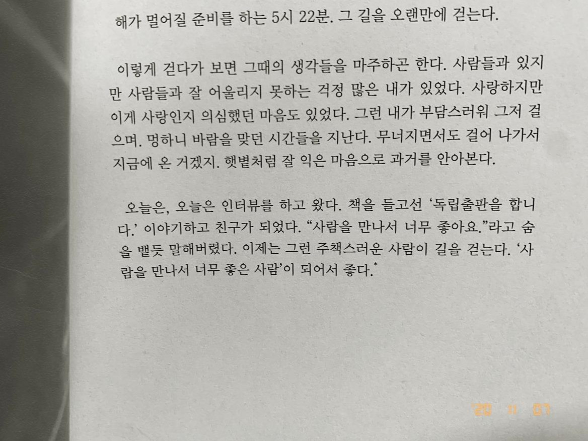 흠, 그래서 궁금해졌습니다. '어떠한 걸까, 이제 내 과거는 나에게?' 생각해보니 제가 『멀어서 가까워지는 것들』에 써놨더라고요. 어느 날엔가 과거를 떠올리면서 길을 걷다가 썼던 글에.