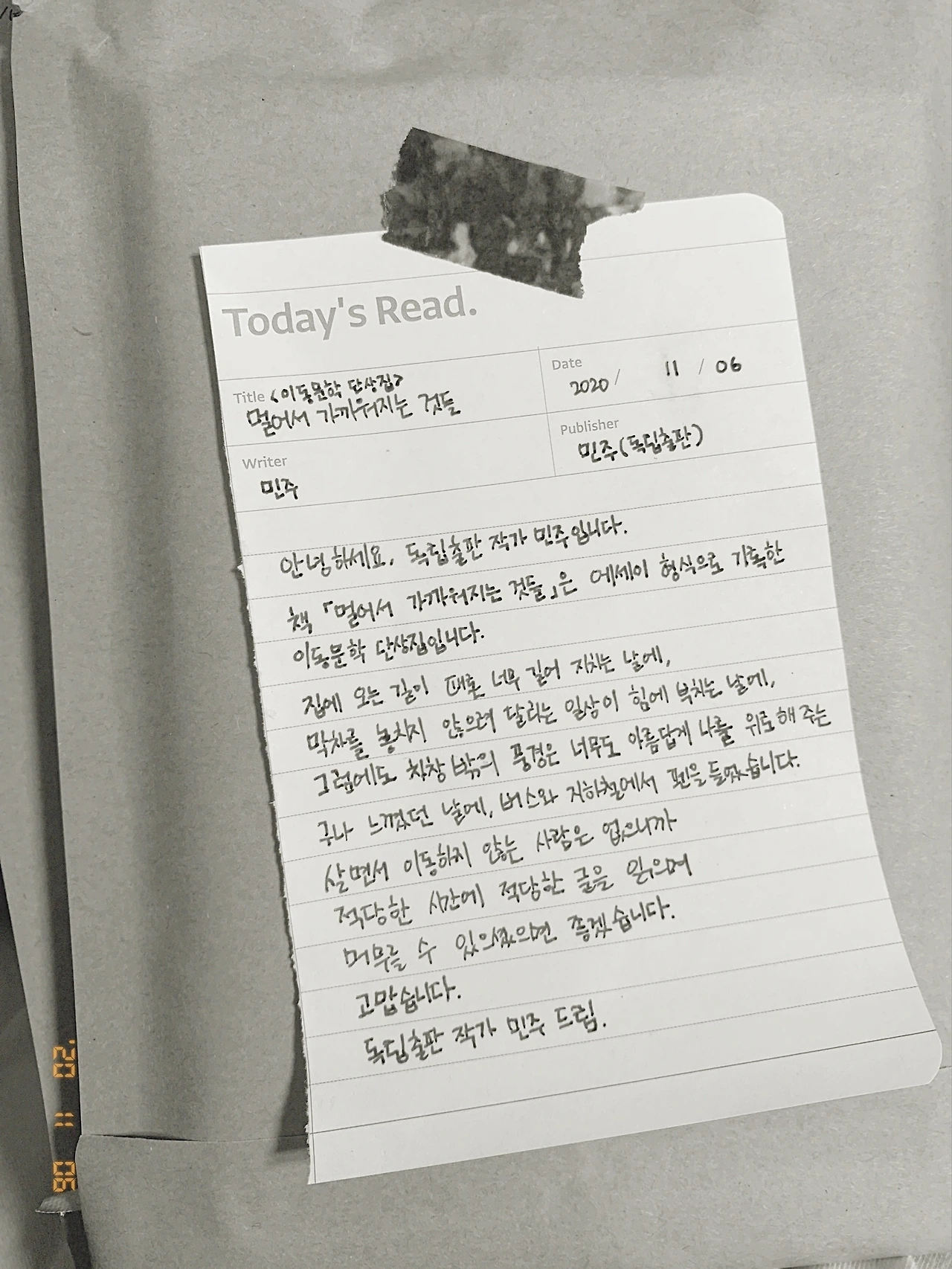 이런 이야기를 말씀드리면 '엄마찬스'라는 반응을 보이는 분도 있었습니다. 표현은 좀 마음에 안 들지만 맞는 말입니다. 감사한 일이죠. 최근에도 엄마가 돈 줄 테니까 일곱 권만 어느 주소의 어떤 분께 보내달라고 하시더라고요. 아는 지인인데 책을 좋아하고, 독서모임을 운영하는 분이라 보내주려고 한다고요. 저는 솔직히 좀 말리고 싶었습니다. 책을 좋아하는 사람이라고 모두가 책 선물을 좋아하진 않거든요. 오히려 자기 취향이 분명해서 선물로 오는 걸 별로 좋아하지 않을 가능성도 꽤 있고요. 그렇지만 엄마의 즐거움인 것 같아서 모른 척 포장을 시작했습니다.