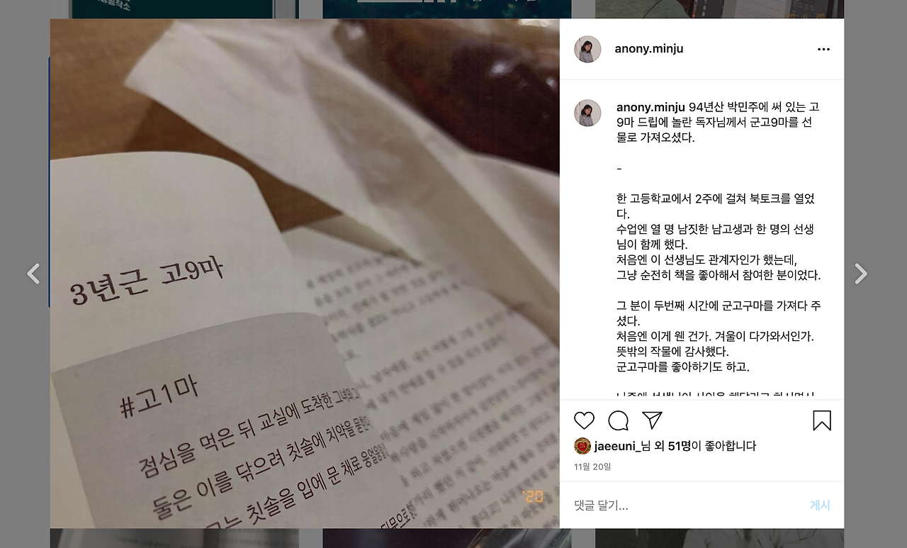 반응은 당연히 좋았고, 저도 나름의 수확이 있어서 좋았습니다. 특히 남자 고등학생에게 94년산 박민주란 어떤 느낌일지 걱정이 되었는데, 이해가 되기도 하고 표현 방식이 유쾌하다면서 좋게 평가를 해 줘서 마음이 놓이더라고요. 한 선생님도 수업을 들으러 와서 제 책을 읽고 마음이 뭉클해 졌다고 하셨어요. 그리고 난생처음으로 독자님께 작물을 선물 받았어요. 그 선생님이 읽기에 94년산 박민주의 고구마 드립이 너무 인상적이어서, 군고구마를 선물해 주셨거든요. 그때 참 마음이 울컥해서 인스타그램에 길게 기록을 남겼던 기억이 납니다.