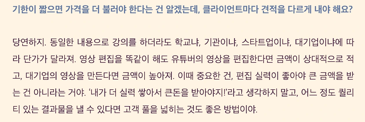 아무튼 저무튼, 그저 뉴스레터를 읽고 뉴워커 분들도 돈은 정신건강에 좋으니 잘 얻었으면 좋겠고, 거기에서 나처럼 적용점 같은 걸 얻어가면 좋지 않을까 싶다. 갑자기 '얼마에 해줌? 선 제시ㄱㄱ'라고 했을 때 머리가 띵해진다면, 이거라도 기억해보는 거지. 클라이언트의 규모, 일의 형태, 기한!