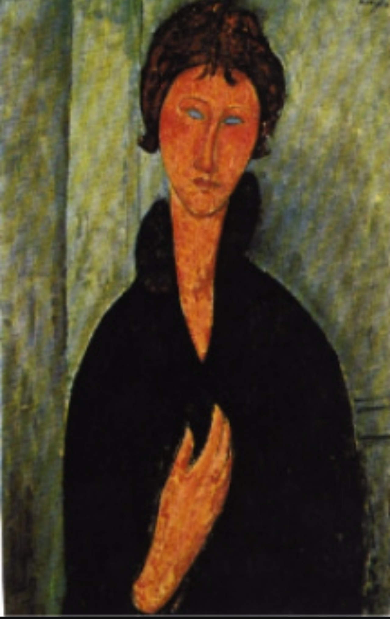 모딜리아니 작품. <푸른 눈의 여인>. 무대에 걸려있던 검은 옷의 여인 그림이 그림이었던 것으로 기억한다.