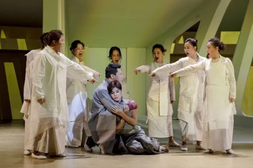 그렇다, 아름다운 여성 헬레네를 남자 배우가 연기한다. 위의 사진 속에서 정 가운데, 안겨있는 배우가 헬레네 역. 안고 있는 배우가 메넬라오스 역.