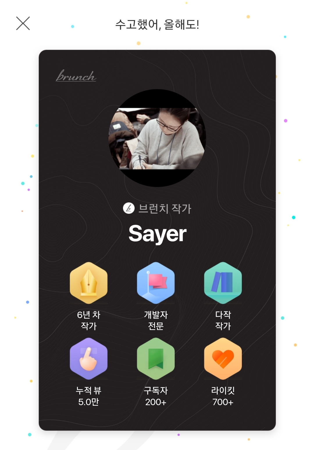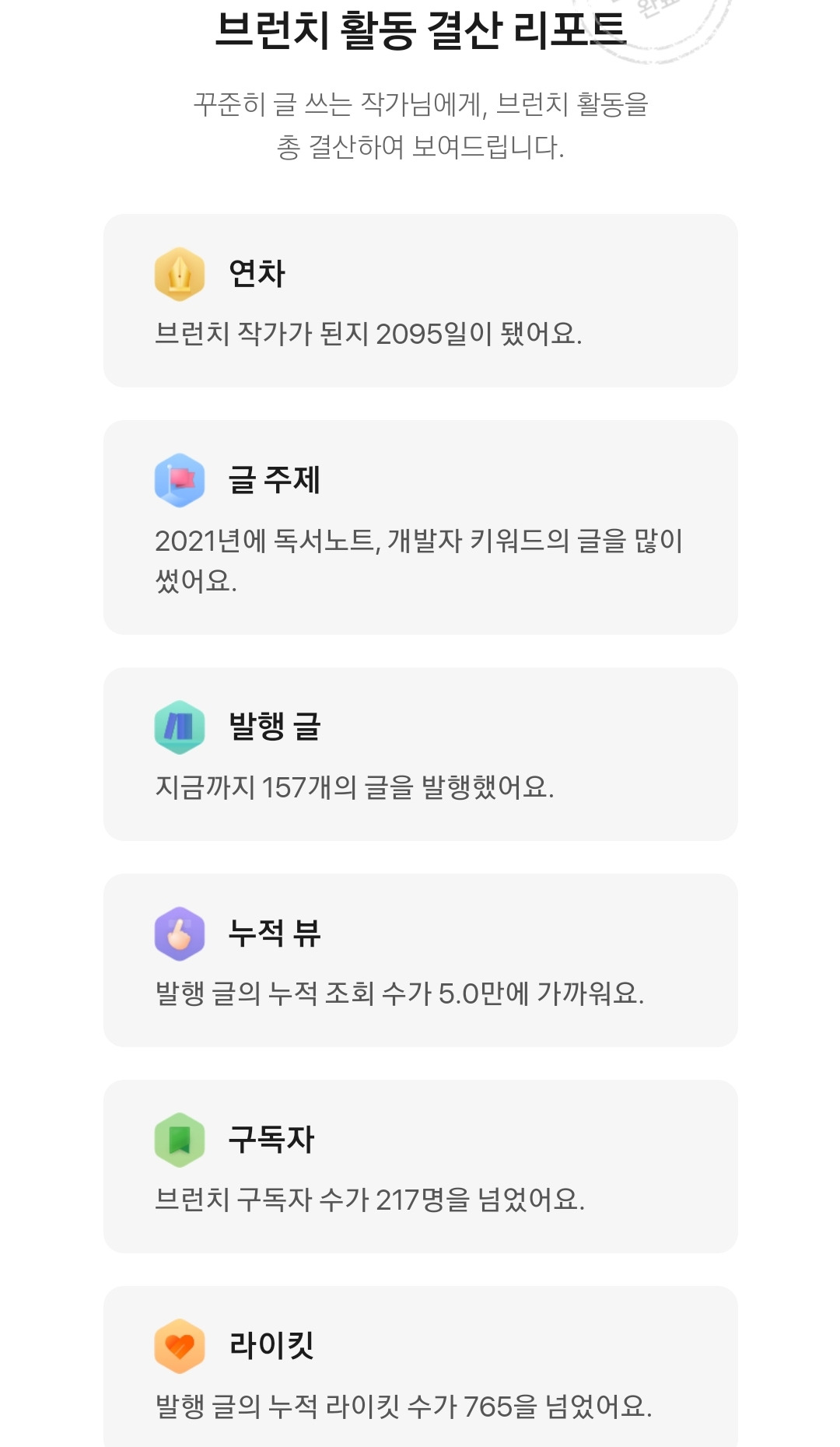 하단의 결산 리포트를 보니, 2021년에 많이 쓴 글의 주제에 따라 부여하는 것 같다. 2021년 상반기에 나는 한창 프로그래밍 독학을 하겠다고, 그래서 올해 안에 취업을 하겠다며 노력하던 때였다. 그래서 공부 기록을 어디에서나 볼 수 있는 곳에, 논리 정연하게 남기는 연습을 하겠다며 브런치도 이용했다. 티스토리와 깃허브도 이용했는데, 브런치에서 개발에 관한 글 쓰기를 그만둔 시기와 유사하게 다른 플랫폼에서의 활동도 뚝 끊겼다.