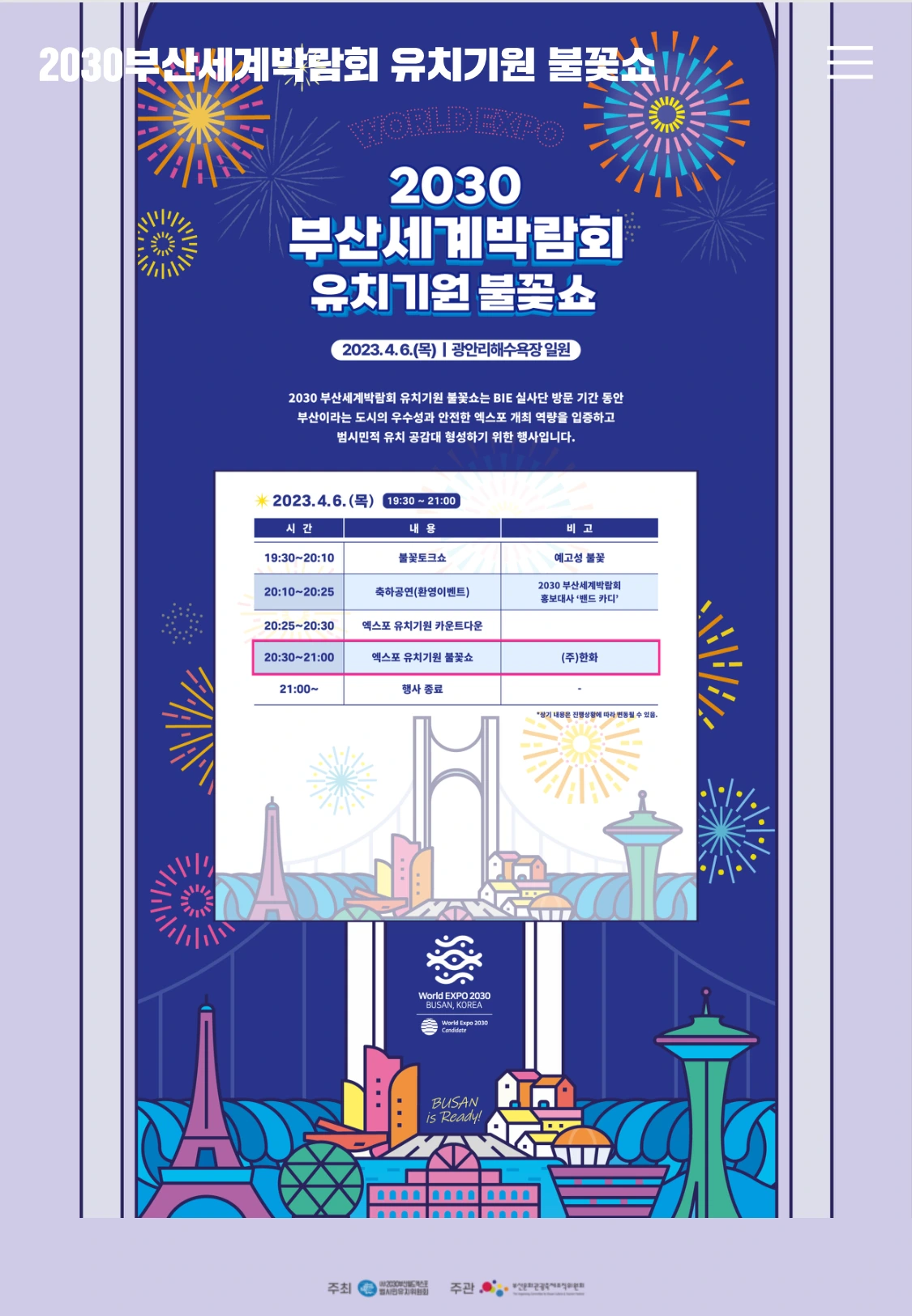 여행을 앞두고 1주일 전에 알게 된 것이 있는데, 우리 모녀가 여행하는 이 기간 동안 부산에서 '세계 엑스포 유치 기원'프로젝트를 진행한다는 정보였다.