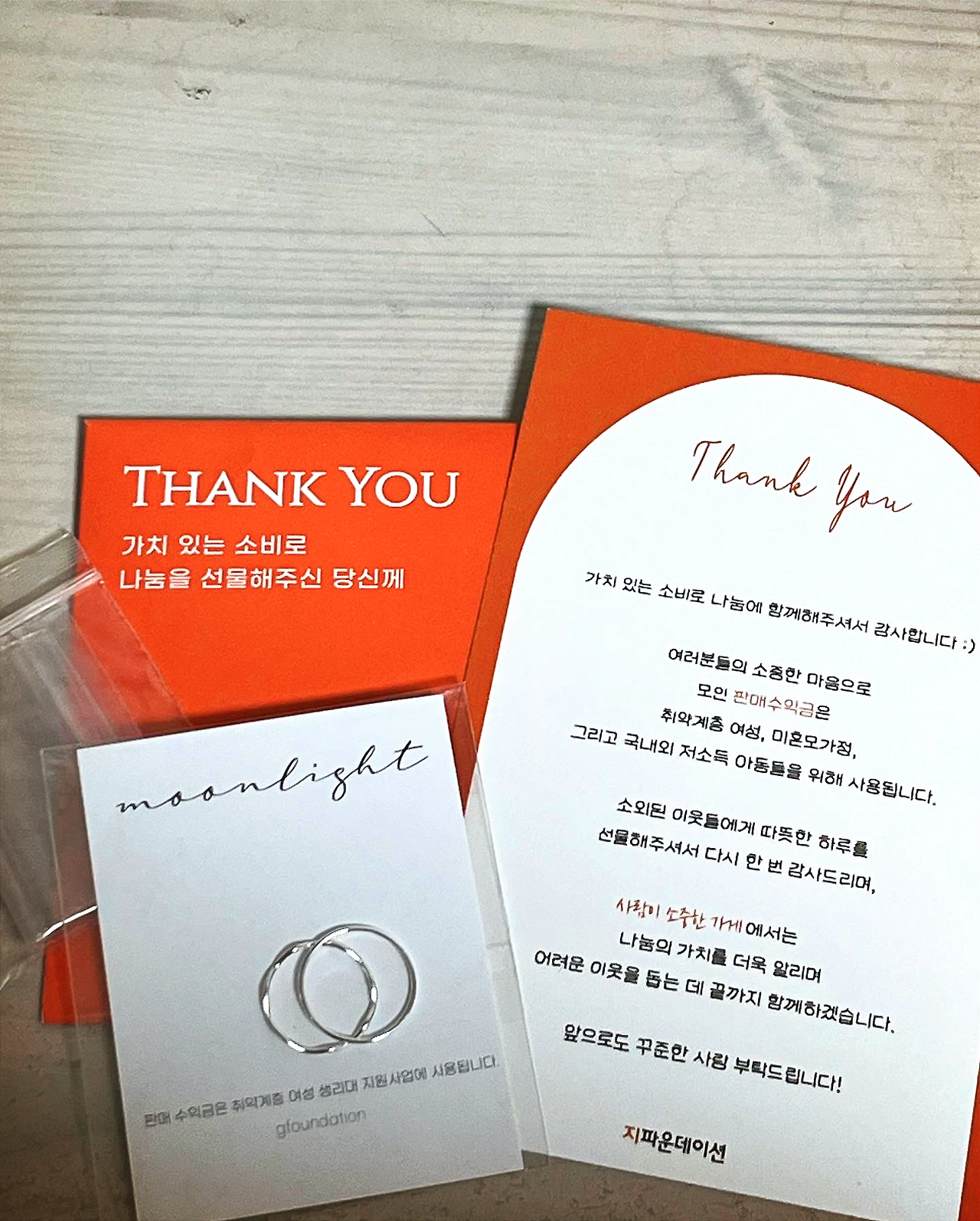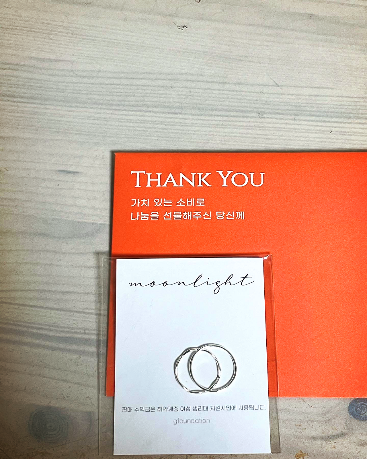 세트가 1만 원대인 데다, 생리대기부 반지라고 한다. 나는 내가 경제활동을 하기 시작하면, 빠트리지 않고 꼭 소방과 생리대후원에 기부할 거라고 오래전부터 다짐했다. 그런데 레이어드링을 갖고 싶은 내 앞에 생리대후원 레이어드반지 세트가 나타났네? 수십 번의 “다음에 다시 올게요 / 더 둘러보고 올게요 “는 이걸 발견하기 위해서였나?라고 생각하며 재깍 결제했다.
