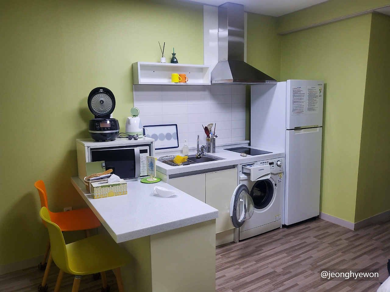 이후 도보로 도착한 숙소. 사장님께서는 친절하셨고 추가로 요청드렸던 탁자도 넣어주셨다. 현재 연구를 진행 중이기 때문에 여행 중이라 해도 연구를 소홀히 할 수는 없어서 식탁과 공부할 수 있는 책상을 분리해야겠다는 생각에 요청드렸는데 도움 주셔서 감사했다. 숙소는 사진과 같이 깔끔했고 미리 쓱배송으로 주문해놓은 생수나 쌀과 같은 음식들도 도착해 있었다.