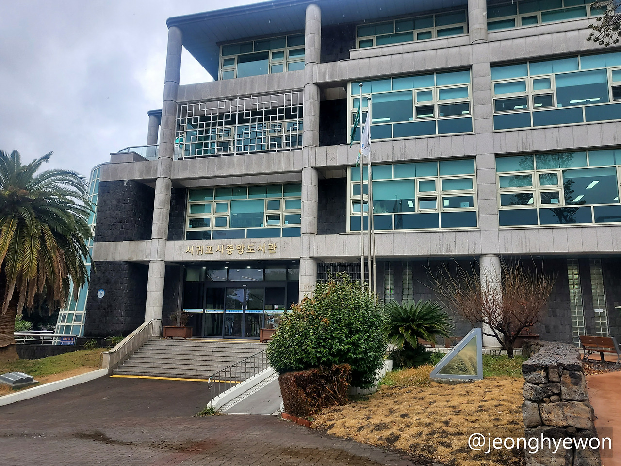 이후 조금 더 걸어 서귀포시중앙도서관으로 향했다. 나는 장기여행을 가게 되면 꼭 도서관을 들른다. 그리고 현재 진행하고 있는 연구가 있기 때문에 여행 중이라 해도 완전히 연구를 덮고 다닐 수는 없는 노릇. 엎어진 김에 쉬어 가라고, 주말까지는 비가 온다고 했으니 아예 쉬엄쉬엄 연구도 하고 내가 좋아하는 도서관도 들러보자는 생각이 들었다. 그렇게 마주한 도서관의 모습은 생각보다 크고 좋아 보였다.