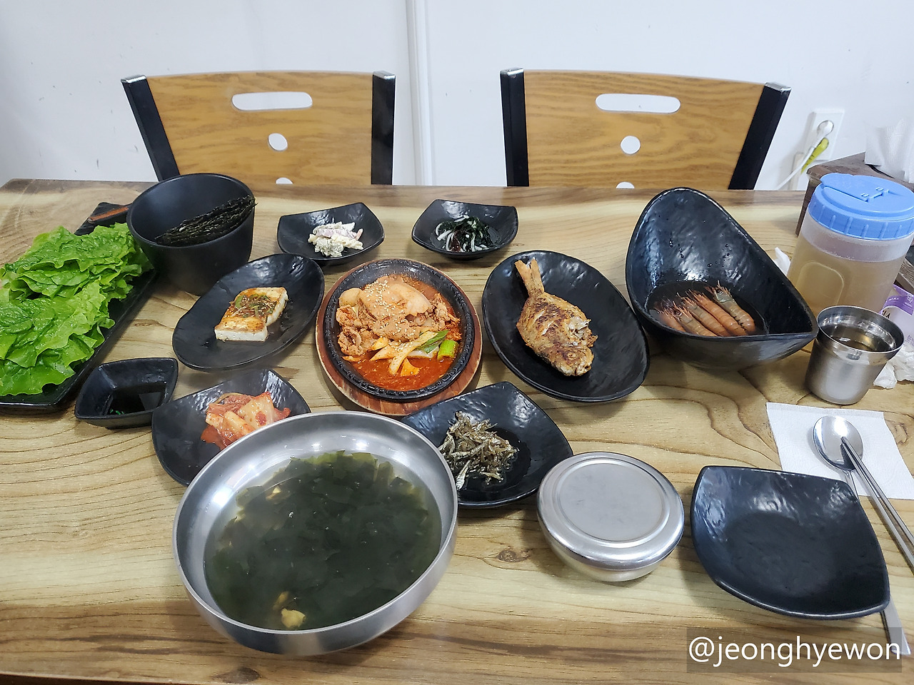 아무래도 혼자 다니는 여행이다 보니 1인분도 가능할까 살짝 걱정이었지만 다행스럽게도 빠르게 준비해 주셨다. 그리고 내 눈앞에 완성된 놀라운 결과물. 딱새우 다섯 마리는 모두 실했고 사장님께서 말씀해 주신 대로 까먹으니 손쉽게 발라 먹을 수 있었다. 제육볶음과 생선구이도 맛이 좋았다. 오늘은 첫 식당부터 성공해서 인지 비가 오더라도 즐거운 시간을 보낼 수 있을 것이라는 예감이 들었다.