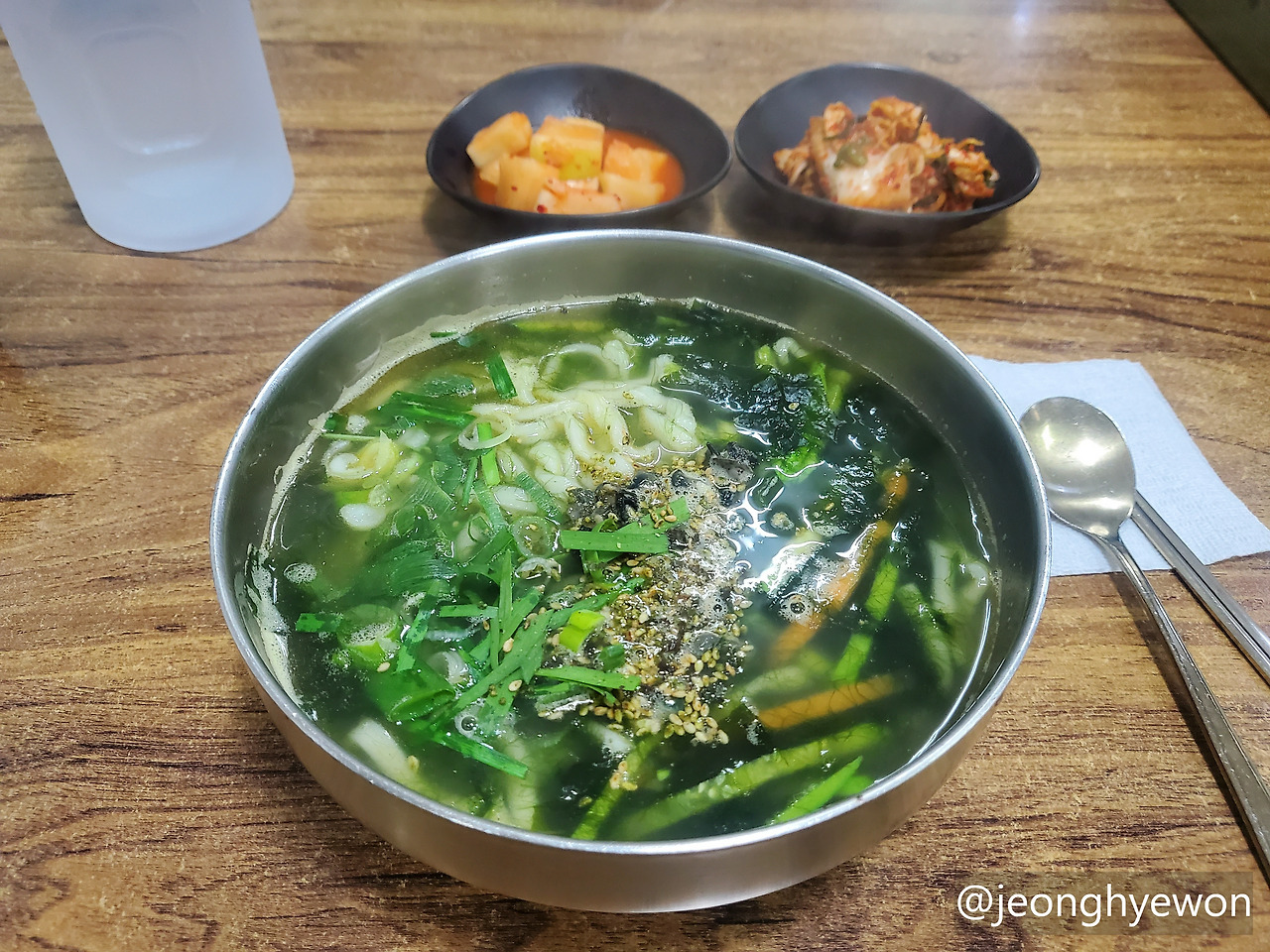 오늘의 저녁은 보말칼국수였다. 딱새우장 정식과 함께 꼭 먹어보고 싶은 메뉴였기에 빗길을 열심히 걸어서 식당에 도착했는데.. 이게 뭐람. 칼국수집은 미용실로 바뀌어있었다. 이럴 줄 알고 지도와 블로그 등 각종 최신 게시물들을 다 체크하고 갔음에도 식당을 가는 데에 실패했다. 뭐든 신속정확한 서울과는 달리 인터넷 업데이트는 한참 느리구나 싶었다. 빗줄기는 점차 굵어지는데 망연자실로 미용실 앞에 서있다가 이내 정신을 차렸다. 이쯤 되면 오늘 꼭 보말칼국수를 먹고야 말겠다는 의지가 불타오를 정도였다. 그렇게 폭풍검색을 마치고 도착한 보말칼국수집. 소한마리국밥도 궁금했는데 오늘은 꼭! 보말칼국수를! 먹고 싶었기에! 바로 주문을 하고 기다렸다.