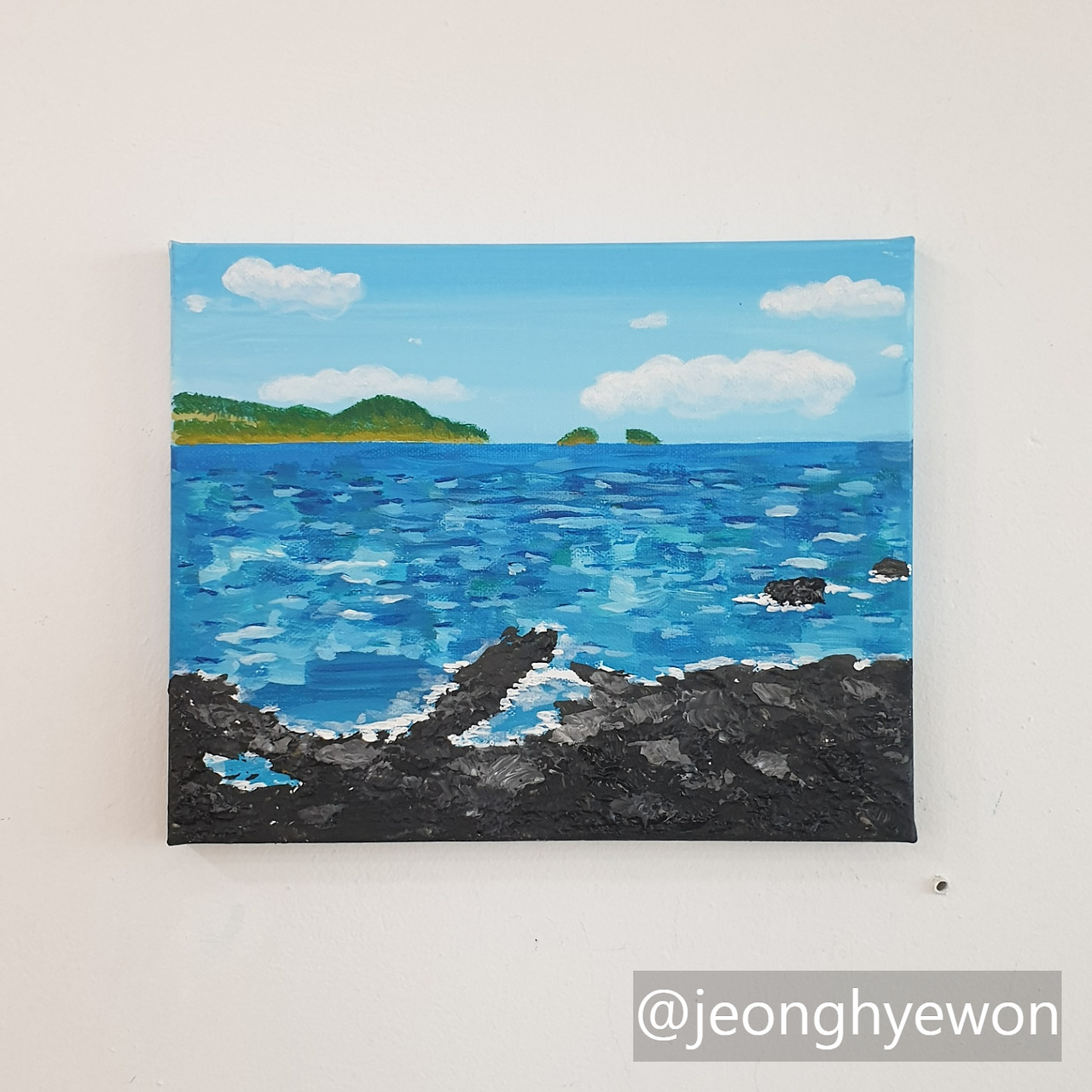 법환포구에서 바라본 바다. 현무암은 나이프를 활용해 거친 질감을 표현해 보았고 가장 중앙에 보이는 작은 섬은 형제섬이다.