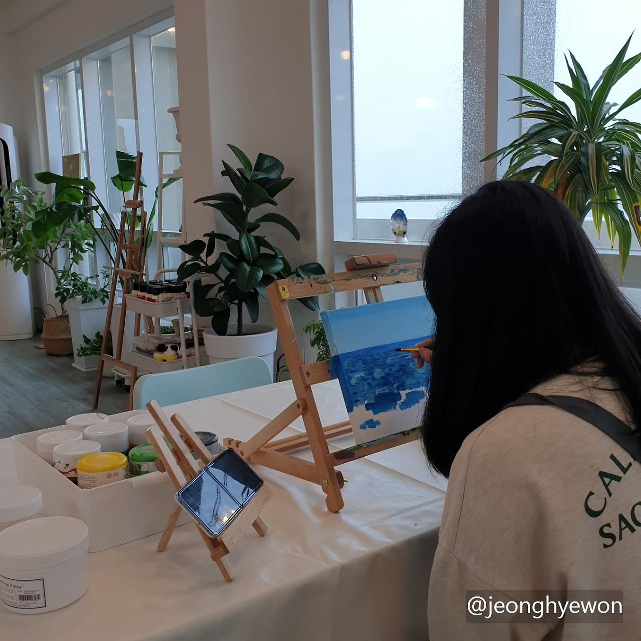 오른쪽 통창엔 건물 사이로 바다가 조금씩 보였다. 그리고 실내는 잘 정돈되어 있고 차분한 분위기인 공간이었다. 길치와 요리 젬병에 미술 젬병이었던 나는 내가 그림을 제대로 그릴 수 있을지 너무 걱정이었는데 살갑게 대해 주시는 선생님 덕분에 걱정은 눈 녹듯 사라졌다. 내가 그리고 싶었던 그림은 법환포구에서의 바다였다. 워낙 바다를 좋아해서 바다를 꼭 그리고 싶었는데 제주도에서 처음으로 만났던 법환포구의 바다색은 다른 곳에선 한 번도 볼 수 없었던 색이었기에 그림으로도 남기고 싶었다. 네이비톤을 잘 살려보고자 붓질을 시작했는데 즐겁기도 했지만 생각보다 어려웠다. 어려웠던 이유는 그림 자체가 어려운 게 아니었다. 붓질을 하면서도 내 머릿속은 자꾸 과거와 미래를 오가고 있었기 때문에 어려움을 느꼈다.