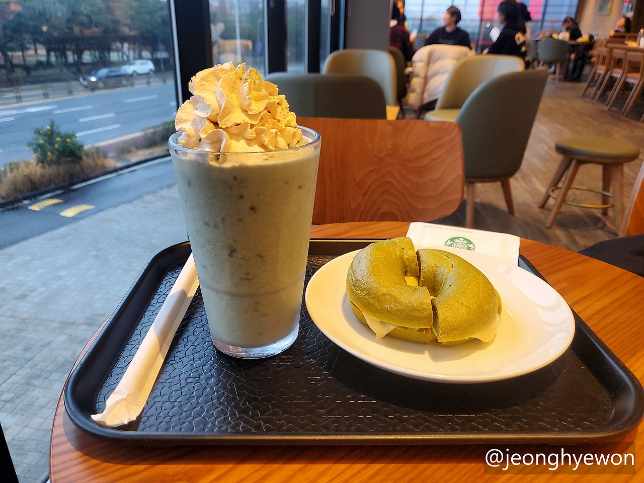 에스프레소 휩으로 변경한 제주 쑥떡 크림 프라푸치노와 제주 녹차 베이컨 치즈 베이글. 둘 다 초록초록한 메뉴들인데 조명이 아쉽다.