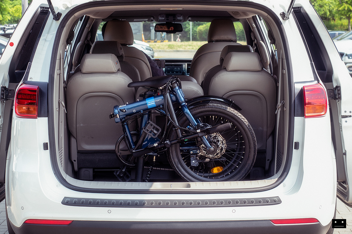 여기에 핸들까지 아래로 접으면 끝! 집이나 사무실에 보관하기에도 좋고요. 승용차 트렁크에 넣어도 쏙 들어갈 정도로 부피를 대폭 줄일 수 있습니다.