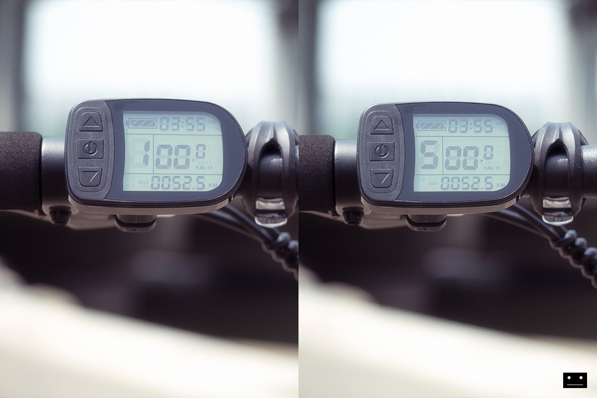 편의 기능도 있습니다. 위쪽 버튼을 길게 누르면 LED가 켜지고요. 전원 버튼을 누르면 현재 속력, 평균 속력, 최고 속력을 확인할 수 있습니다. 아래 버튼을 길게 누르고 있으면 갑자기 자전거가 혼자 가기 시작하는데요. 자전거를 끌고 가기 쉽게 할 수 있는 기능이라고 하네요. 다만, 길게 누르고 있어야 하는 번거로움, 그리고 나중엔 제가 걷는 게 훨씬 빨라서 잘 쓰지는 않게 됐습니다.