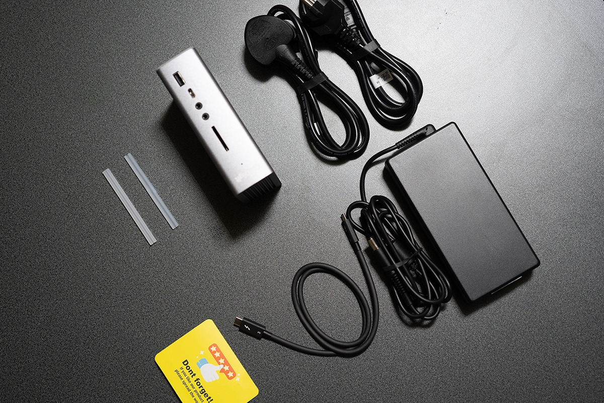 구성품은 영상에서 소개한 게 끝일 정도로 간단하니 간단히 구성품 소개와 인상만 더한다. 봉인 없는 상자를 열면 두 개의 전원 케이블(Type F, Type G), 전원 어댑터, 썬더볼트3 케이블, 고무 발판 스트립, 본체가 들어있다. 한국에 들어오면서 전원 케이블이 하나 더해진 모양이다. DC 전원 어댑터 규격이 특이한 게 아니므로 다른 기기의 케이블을 어댑터와 연결해도 문제없이 쓸 수 있을 것 같다.