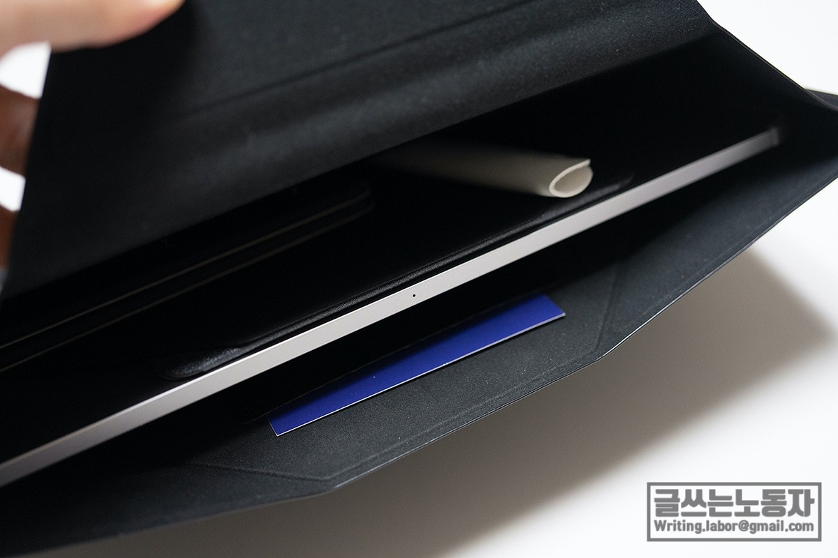 슬리브의 구조도 간단하다. 합성 가죽인 PU 가죽으로 이뤄진 슬리브의 한쪽 면에는 고무 패킹이 있고, 반대쪽에는 조금 뜬금없다싶은 부들부들한 부분이 있다. 입구 부분의 자석 뚜껑을 젖히면 슬리브 내부가 보인다. 부들부들한 면에는 얇은 경계가 있어 이 부분을 젖혀 태블릿 외 다른 물건을 넣을 수 있다.