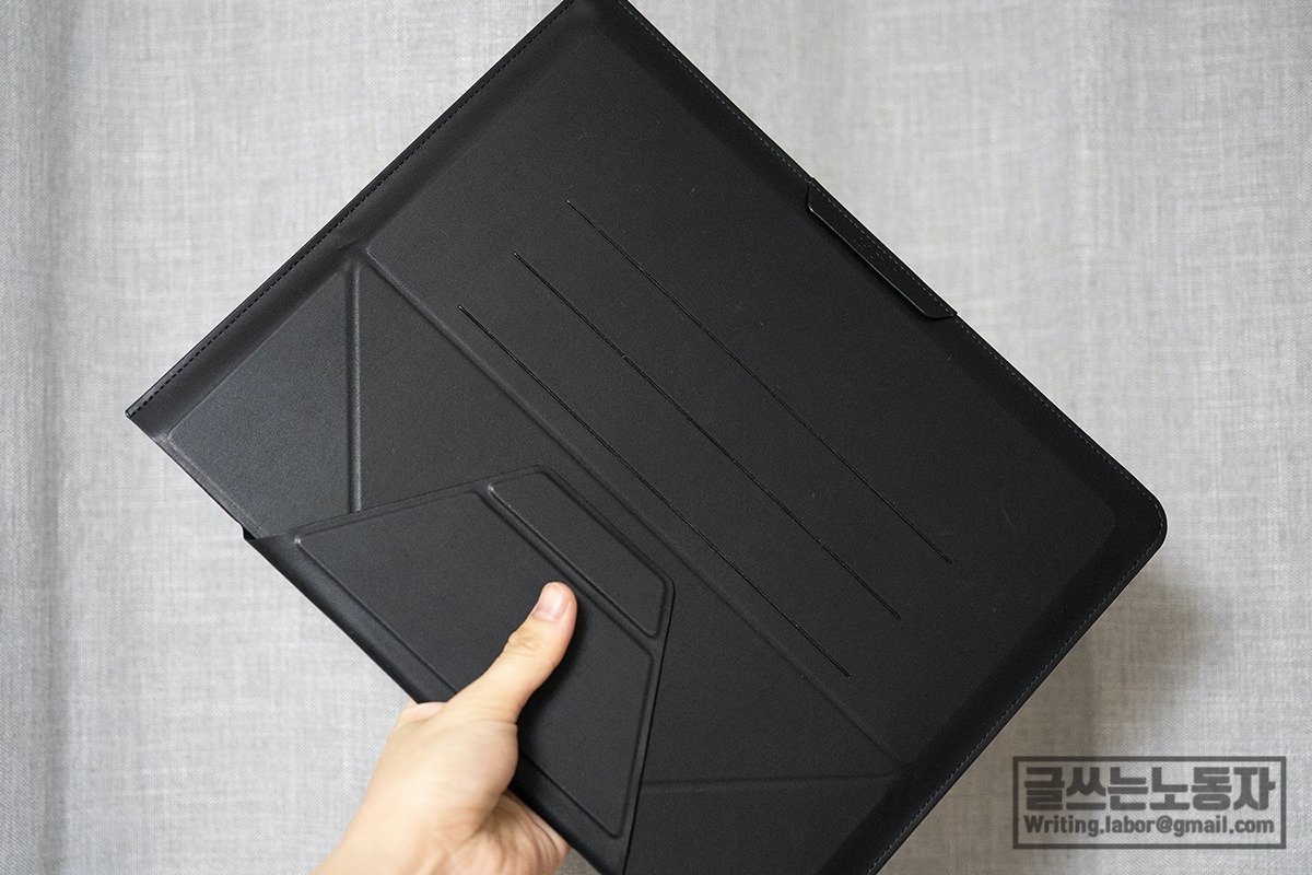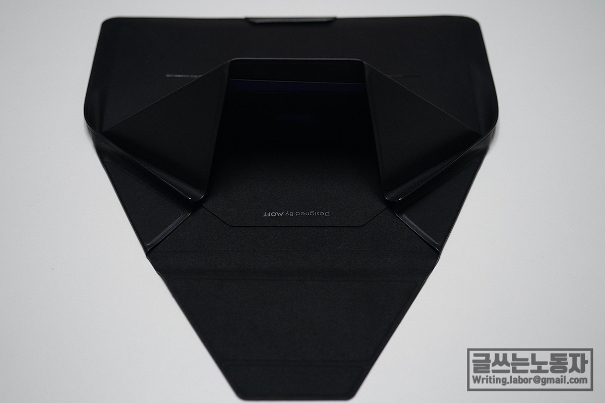 그래서 가로 사용과 세로 사용을 모두 고려하다 보니 모프트 X 태블릿 스탠드의 위치는 조금 어정쩡한 위치에 있게 됐고, 이는 가로와 세로 모두에서 불편한 상황을 연출하곤 했다. 10.5인치 전후의 기기라면 그럭저럭 쓸 만할 지도 모르나, 12.9인치에서 쓰기엔 그 지지력이 아쉽다.