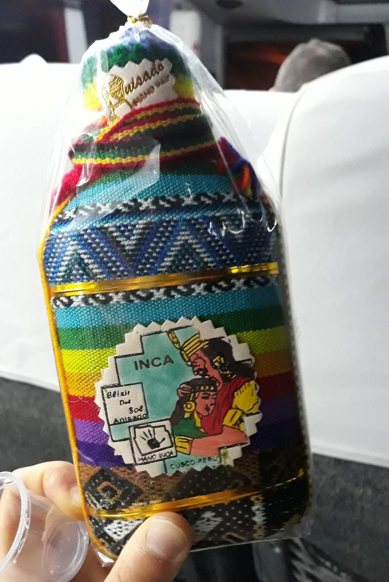 체력이 급격히 떨어짐을 느낄 즈음 알파카털실로 만든 옷과 모자 등을 파는 가게를 마지막으로 투어가 끝났다. 사고 싶은 물건은 많았지만 그날 그날 써야할 돈을 계획해 뒀었기에 꾹 참고 가게 밖에 나와 투어차에 올라 다른 사람들을 기다렸다. 한 20분정도 시간이 흘렀을 까, 모든 승객이 차에 올랐는데 한참 출발을 안해서 왜 그런가 봤더니 가게 앞에 서 있던 젊은 여자가 커다란 배낭을 매고 낑낑거리며 투어차에 오른 것이 아닌가. 투어의 마지막으로 아래 사진과 같이 독특한 병에 든 페루 전통술을 판매하기 위해서였다. 마지막 한 시간 반을 물건을 판매하는 목적의 투어였다는 사실을 알아차리곤 왜 인지 너무 비싼 금액을 주고 투어를 신청한 느낌도 들었다.