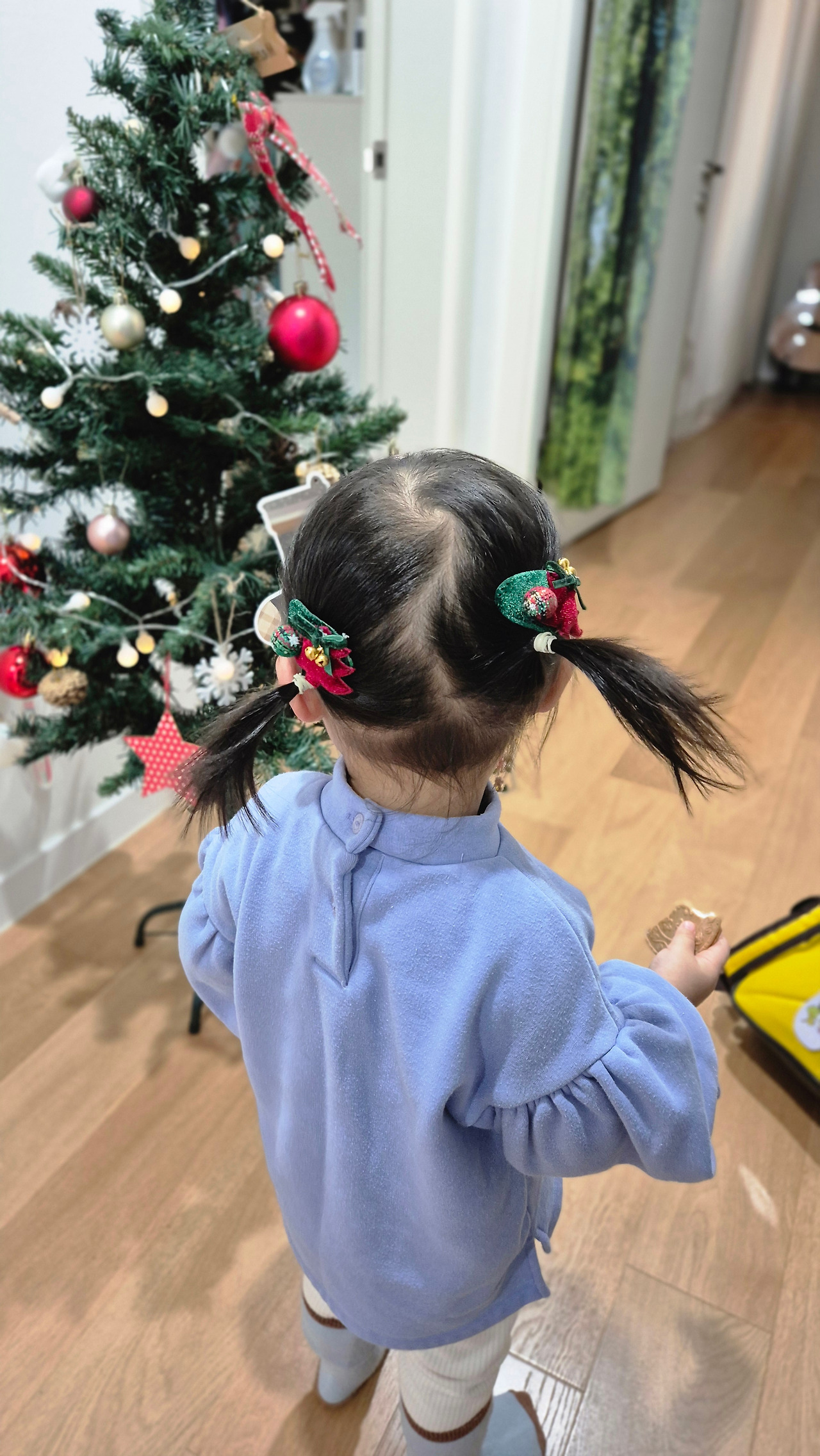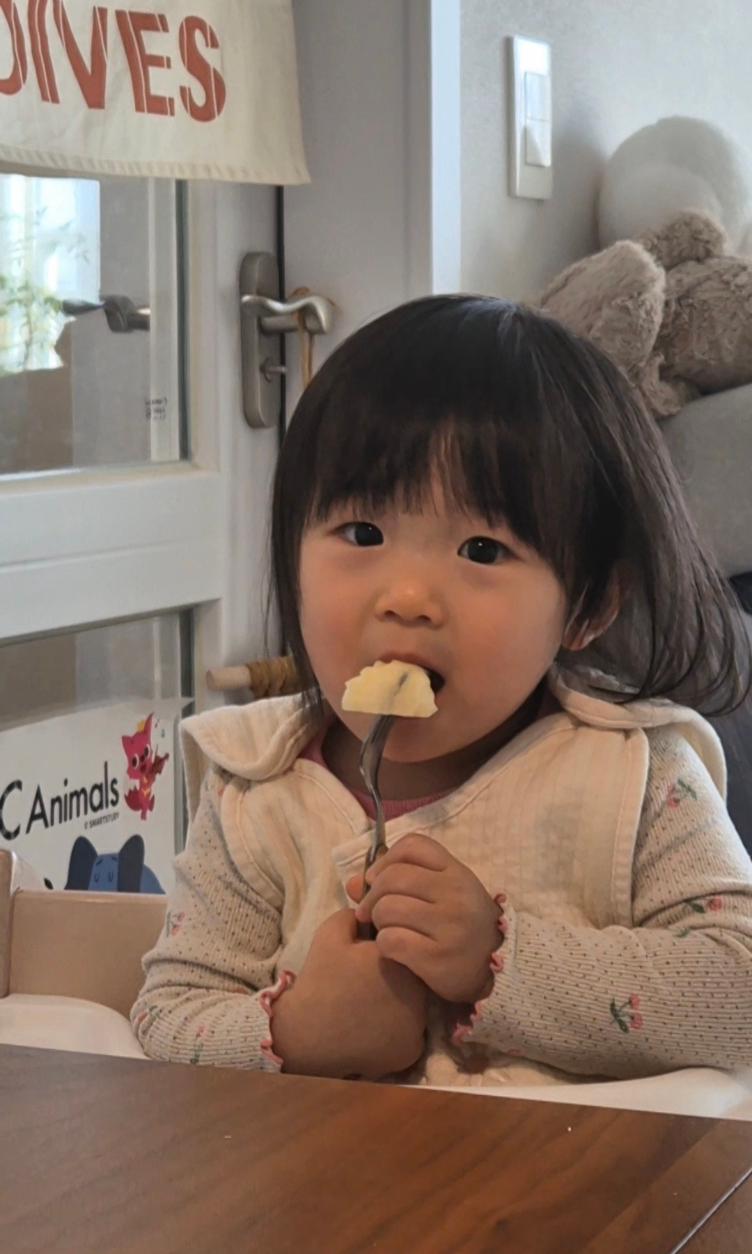 7시 15분쯤 아이가 일어나면 '잘 잤어?' 묻고 사랑한다 속삭인다. 문을 가르키며 '밖에'라고 말하는 딸에게 나가기 전 이부자리를 정리하고 가자고 설득한 뒤 커튼을 치고 성에를 닦고 환기를 시킨다. 안아달라는 13.4kg의 딸을 '아구구' 곡소리와 함께 안고 부엌으로 간다. 그리고 씻어놓은 딸기와 바나나 중 하나를 선택하게 하고 책 몇권을 함께 오물거리며 읽는다.