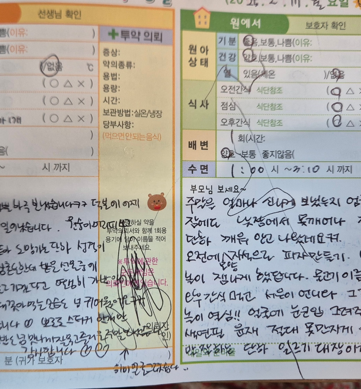 시계가 8시 10분을 향하면 슬슬 눈치를 보며 아이의 컨디션을 파악하고 화장실로 데려가 엉덩이를 씻기고 재빨리 양치와 세수를 시킨다. 로션을 바르며 옷을 갈아입자 꼬드긴다. 안 입는다고 버틸 시에는 '옷 입고 싶어지면 와서 얘기해'라고 다소 엄중하게 한 뒤 등원 준비물(물통, 칫솔, 수저통, 여벌옷 체크)을 가방에 넣는다. 그즈음 되면 옷을 갈아입겠다고 오는 때도 있는데, 그래도 딴청을 부리는 날에는 틈을 이용해 아이 수첩을 적는다. 물론 내 딸은 글씨 쓰는 나를 가만두지 않아서 부리나케 달려와 무릎에 앉혀달라 애원한다. 그렇게 딸은 펜을 들고 알림장 코너 구석에 낙서를 하고 난 지난 밤 어떤 일이 있었는지 상세하게 떠올리며 급하게 휘갈겨 적는다. 그와중에도 선생님들께 감사하는 마음으로 활동 사진에 대한 감상평은 놓쳐선 안 되는 것이 포인트다.