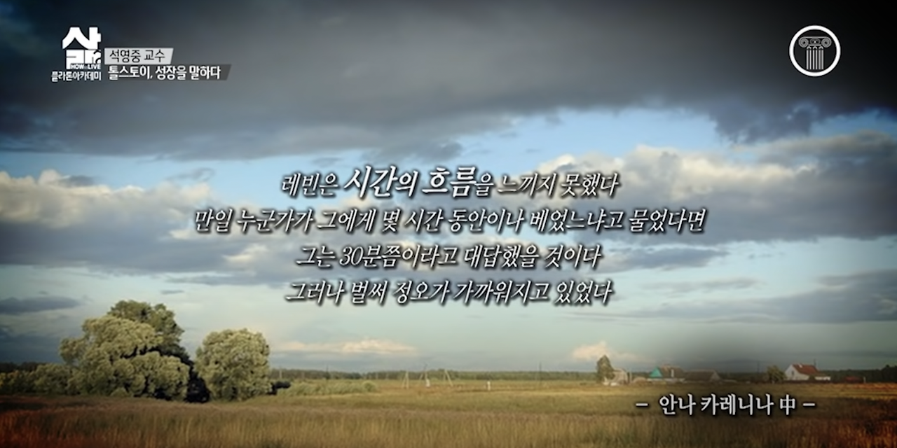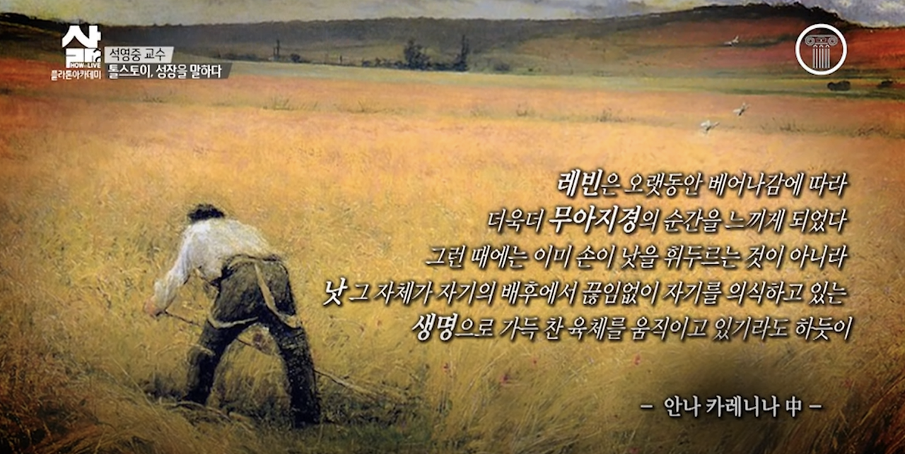 두 번째 영상은, 톨스토이가 인생에서 추구했던 가장 큰 가치 '성장'에 대해 설명하는 강의였다. 그는 '성장'의 조건으로 세 가지를 꼽았는데 1) 몰입 2) 소통 3) 죽음을 기억하는 것이었다. 그는 책 안나 카레니나에서 레빈이라는 캐릭터를 통해 몰입의 충만함을 보여준다. 지주인 그는 농부처럼 밖에 나가 풀을 벨 필요가 없지만 어느 날 문득 풀을 베고 싶어서 풀을 베러 나갔다가 몰입의 경지인, 무아지경를 경험한다. 그가 말하는 몰입은 시간의 흐름을 망각하는 것이었다.