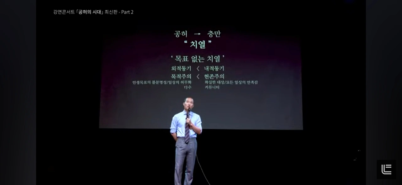 첫 번째 영상은, 우리가 '목표없는 치열'의 삶을 살아야 한다고 말하고 있었다. 토크쇼 진행자는 우리는 어릴 때부터 '목표를 세워야 무엇이든 이룰 수 있다'고 잘못 세뇌되며 살아왔다며, 목표가 있는 치열을 '병든 치열'이라 규정한다. 그러므로 우리는 '치열을 위한 치열', 즉 목표없이 치열하기만 삶을 살아야 현존할 수 있고 충만감도 느끼게 된다고 말한다. 나는 그의 말에 무릎을 탁 쳤다. 그리고 내가 목표없이 살았던 지난 삶을 반성하고 목표를 세웠다고 쓴 글을 지워야 하나 갈팡질팡한 마음이 들기도 했다.