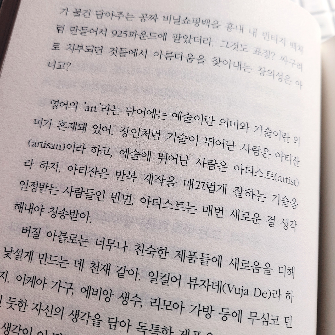 직업인으로서 제가 어떤 것을 원하는 사람인지를 분명히 깨닫게 된 것은 몇 년 전 어떤 책의 한 구절을 통해서였습니다. 홍성태 교수님의 '브랜드로 남는다는 것'이란 책에서 아티잔(장인)과 아티스트(예술가)를 비교하는 대목이었는데 저자는 부수적 설명 정도로 사용한듯한 짧고도 명료한 문장이 제게는 '되고 싶은 나'의 모습을 정확히 자각하게 하는 호명의 순간이었죠.