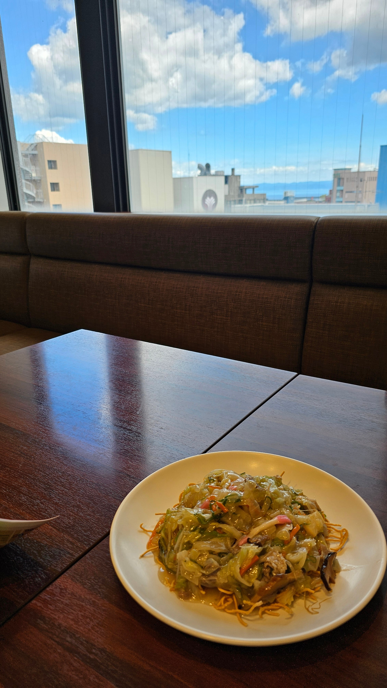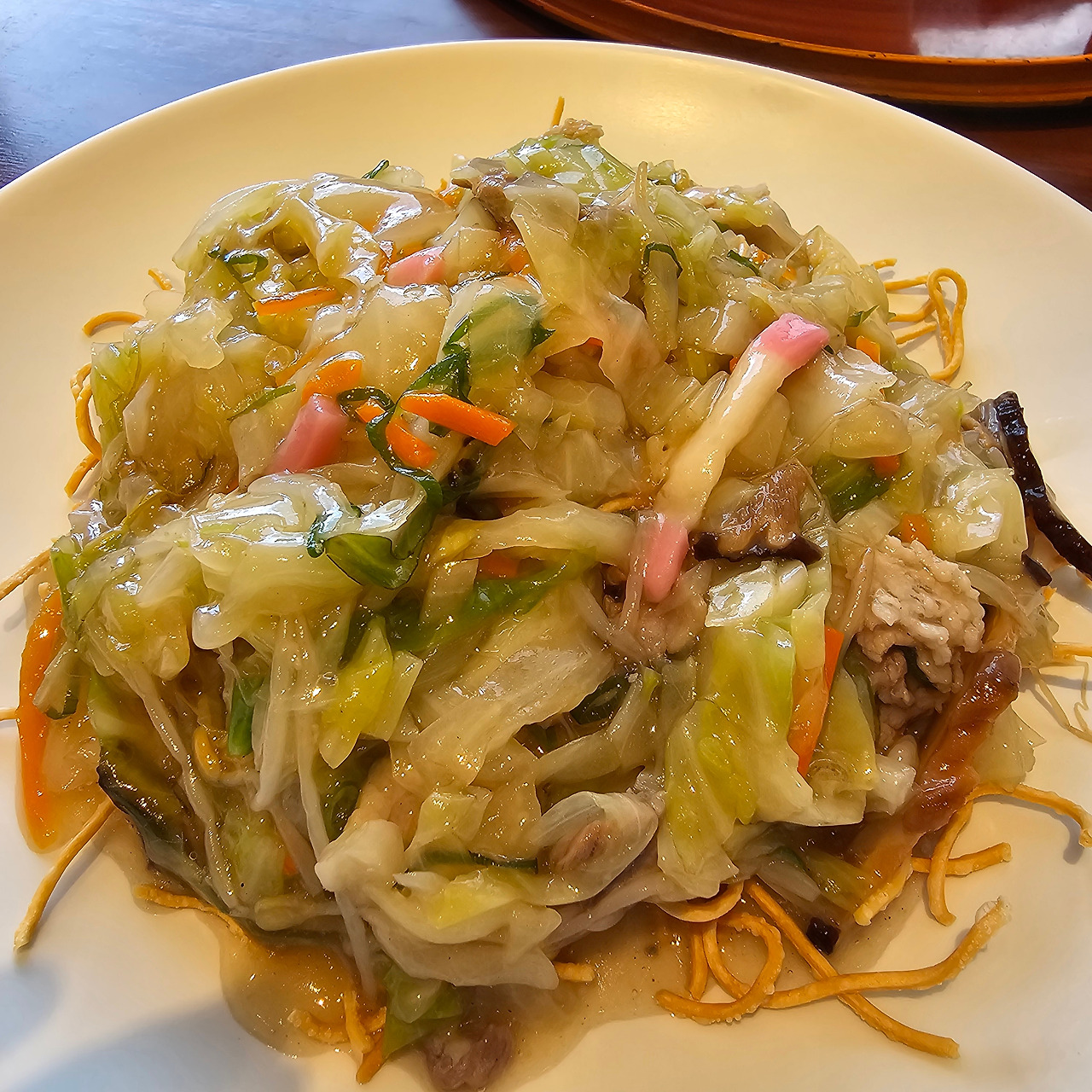 걸쭉한 소스에 양배추, 숙주, 당근 등 야채와 약간의 해물, 돼지고기가 볶아져 얇은 튀김면 위에 부어져 나오더라고요.