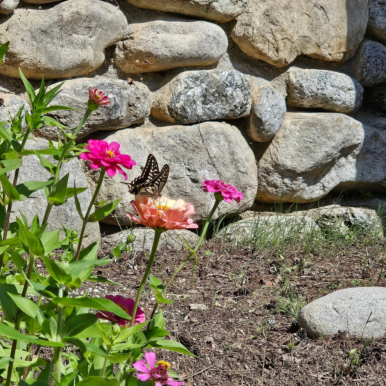 나비는 그렇게 팔랑팔랑 날아서 돌담옆 백일홍꽃에 앉았다. 오랜만에 본 호랑나비가 너무 예쁘고 신기해 사진을 몇 장 찍었다. 가까이 가지 않고 줌을 확대해 찍었긴 하지만 내가 사진을 몇 장 찍는 동안 얌전히 날개를 팔랑거리며 꽃에 앉아있었다.