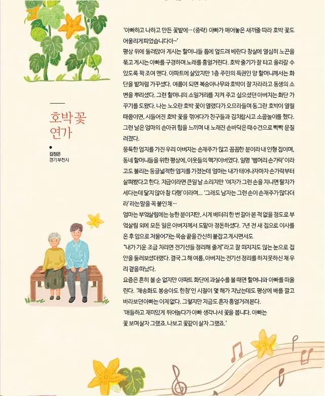 '아빠하고 나하고 만든 꽃밭에…(중략) 아빠가 매어놓은 새끼줄 따라 호박꽃도 어울리게 피었습니다아~♬'