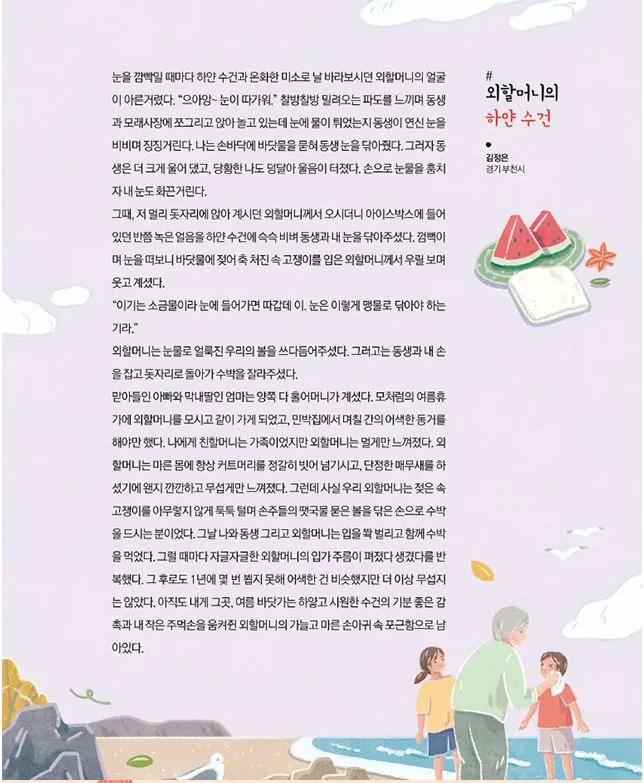 아직도 내게 그곳, 여름 바닷가는 하얗고 시원한 수건의 기분 좋은 감촉과 내 작은 주먹손을 움켜 쥔 외할머니의 가늘고 마른 손아귀 속 포근함으로 남아있다.