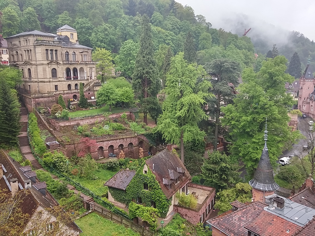 ▲ 독일 하이델베르크, 비에 젖은 초록 나무와 고풍스러운 건물, 중세 기사가 말을 타고 나와도 이상할 것 같지 않은 풍경