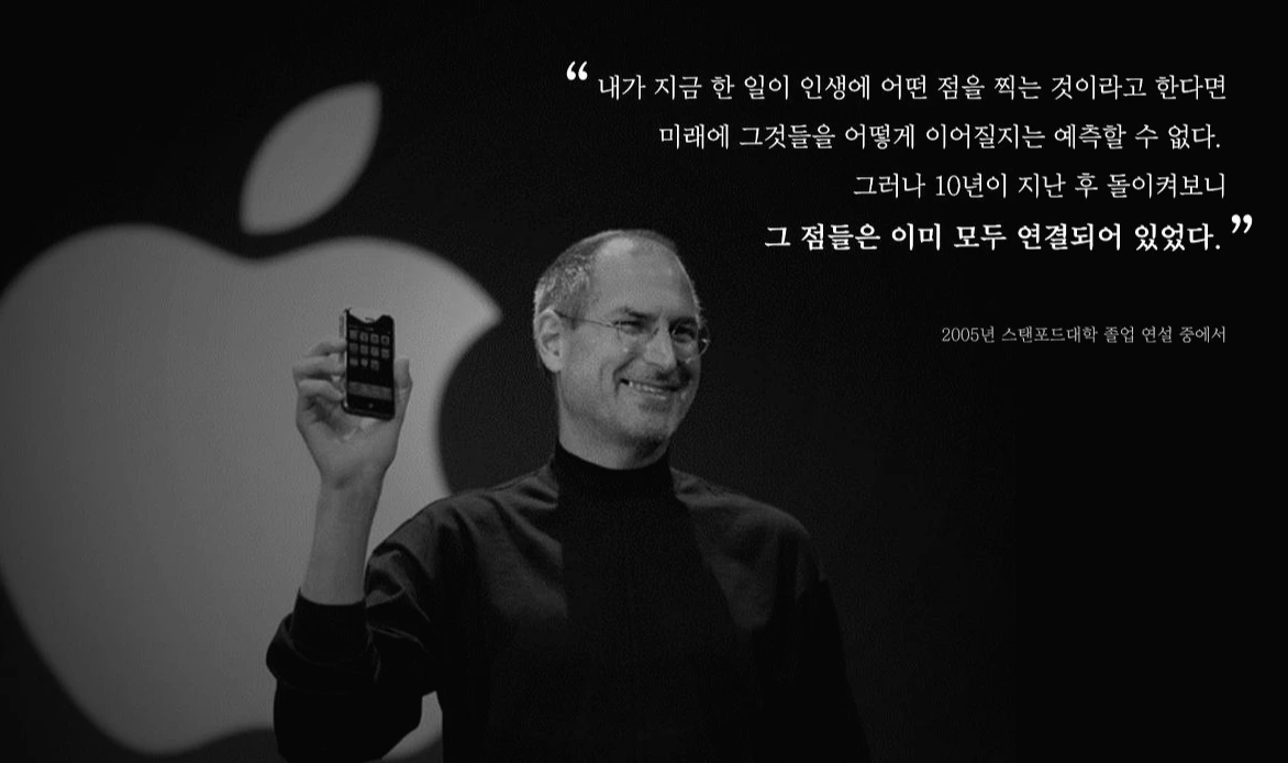 다시 나의 이야기로 돌아오자면, '일단 뛰어들기'를 모토로 삼고 있음에도 늘 마음 한편에 미래에 대한 불안함이 존재하는 모순을 겪고 있었다. 지금 하는 일이나 공부가 훗날 어떤 결과로 나타날지 전혀 모른다는 점이 답답해서, "지금 이걸 배우는 게 어떤 도움이 될까?", "그때 그렇게 하는 게 맞았을까?"를 반문하기도 했다. 그런 나에게 잡스는 이렇게 말해주었다. 미래를 모르는 건 당연하다고, 그러니까 매 순간 마음껏 공부하면서 진정으로 사랑할 수 있는 일을 하라고. 잡스를 만난 후에야 내 삶의 태도가 주던 불안이 오히려 기대로 바뀌었다. 그래서 미래의 내가 어떤 삶을 완성할 지 궁금해하기보단, 지금의 내가 살아가는 삶을 온전히 만끽하기로 했다. 잡스와 같은 호기심과 열정으로 말이다.