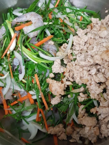 냉동실에 깐 새우가 있어서 물에 살짝 녹인 후 넣었고 저번 김치전 해 먹을 때 남아있는 갈아놓은 돼지고기도 밑간 살짝 하고 마늘과 후추를 넣은 뒤 살짝 볶아서 같이 넣었다. 오징어나 조개를 넣어도 맛이 좋다. 쫄깃거리는 식감이 좋아 아이들이 좋아한다. 겨울엔 부추가 흐들해지고 맛이 없어지니 단맛이 가득 든 대파나 쪽파에 굴을 가득 넣고 만들어도 좋다. 돈 받고 파는 것도 아니니 제철에 흔한 재료 사다가 좋아하는 재료 듬뿍 넣고 만들면 그만이다.