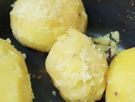 물에만 퐁당 담가 찐 감자만으로도 맛이 훌륭하다. 물에 삶은 뒤 약불로 수분을 날리니 더 파슬파슬해졌다.