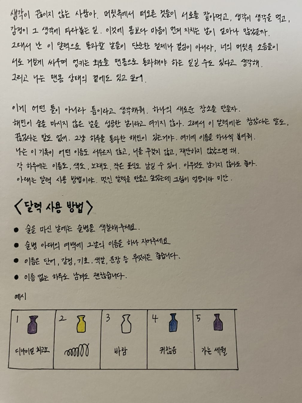 그녀에게 불안이슈로 오토바이를 탈 수 없다 말하며 마치면 데리러 오라고 통보를 했었다. 내가 알고 있는 그녀와 같이 흔쾌히 승락함을 당연히 여겼고 나는 부탁 같은 건 생전 하는 사람이 아니라는 걸 그녀는 알고 있을까 그녀에게 말했던 ‘데리러 와’가 많은 의미를 가지고 있다는 것 또한 그녀는 모를 것이다.