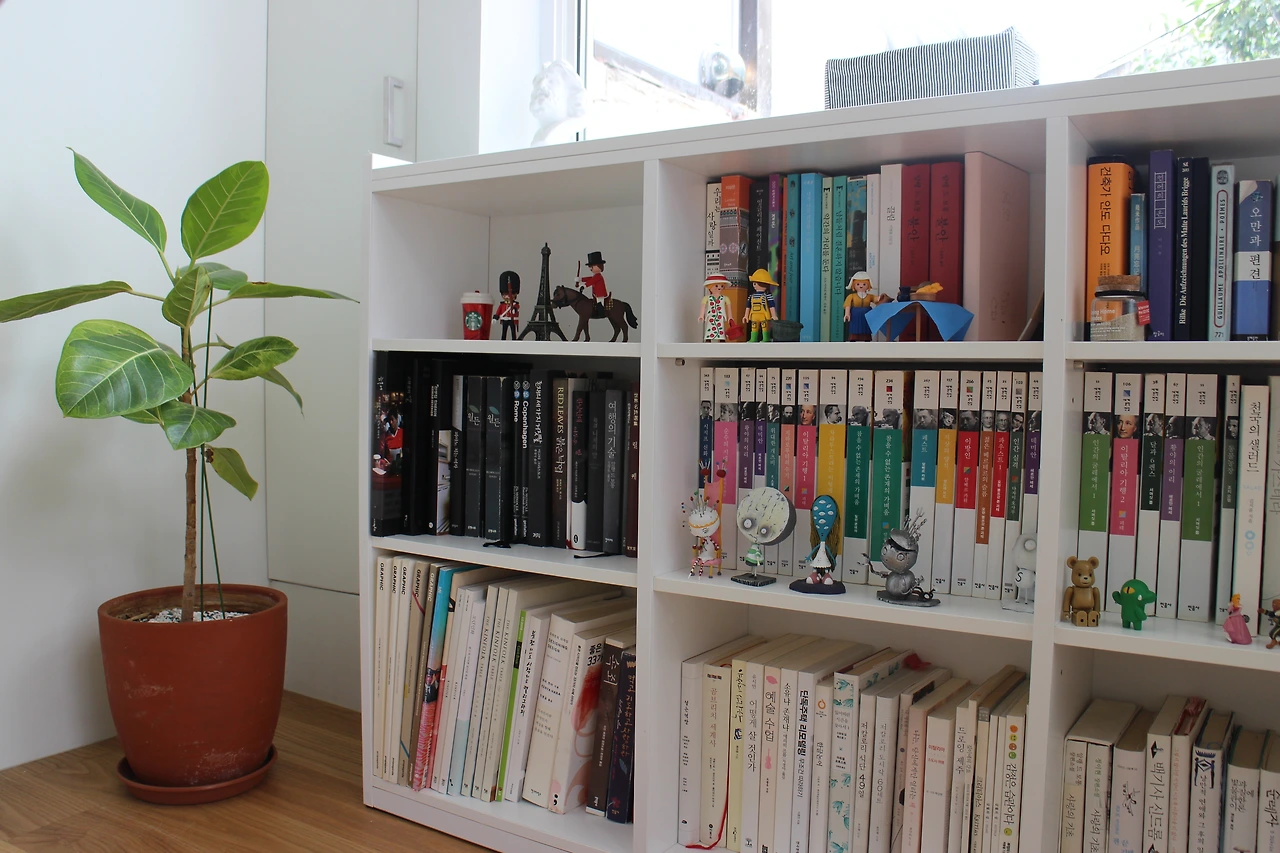 마지막으로 책장이 없어 이사 오고 이 주간 책들을 그냥 창가에 쌓아놓았다. 거실이 좁아서 기성 제품 책장을 놓으면 더 좁아 보일 수 있었기 때문이었다. 고뇌하는 우리를 보다 못한 J실장님께서 창가 사이즈에 딱 맞는 날씬한 책장을 하나 만들어주셨고 비로소 마지막 책짐까지 정리되었다.