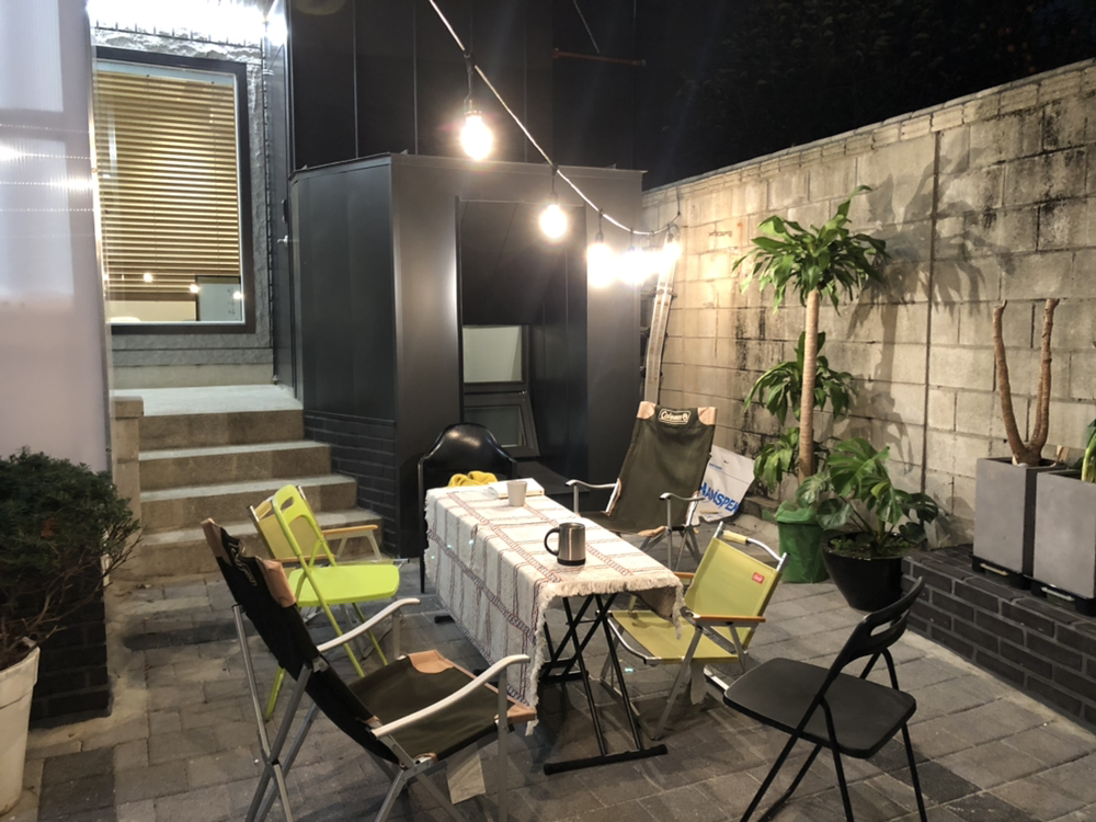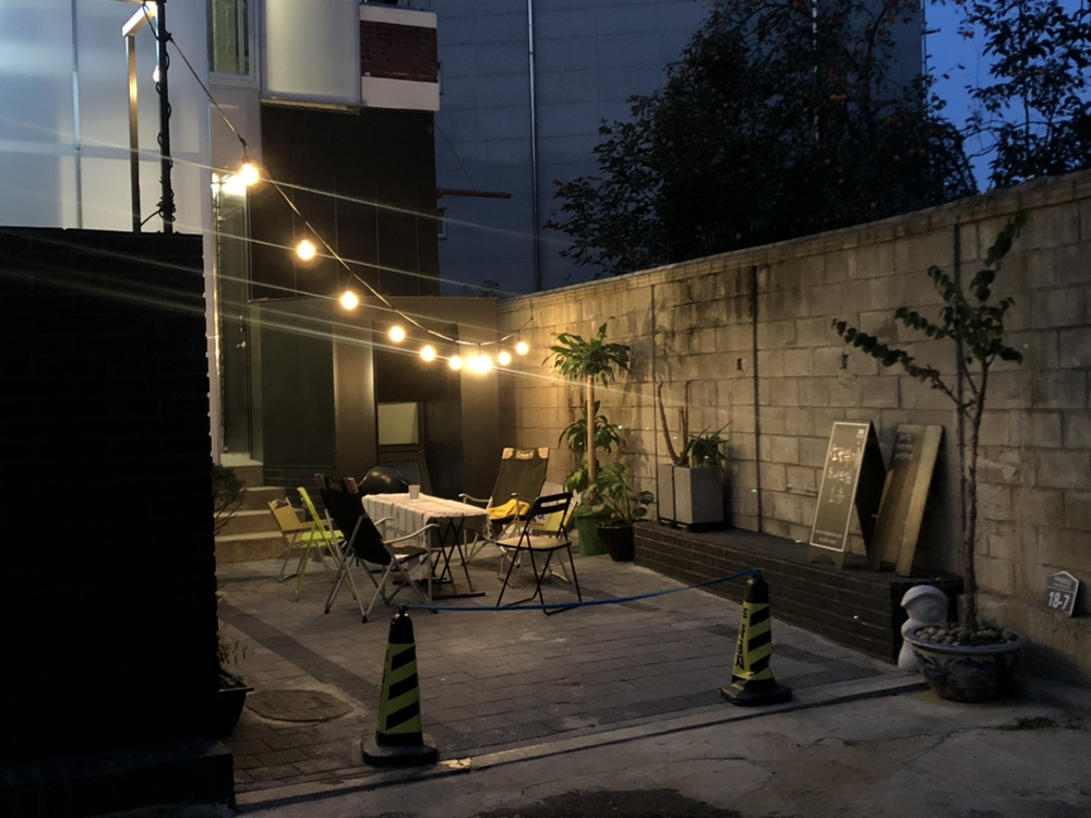 스위치를 켜자마자 나도 모르게 탄성이 터져 나왔다.조명 불빛에 묘하게 부조화를 이루던 마당의 식물과 테이블과 각종 소품들이 하나로 어우러지는 느낌이었다. 골목 끝에 있는 집이고, 외벽도 까만색이라서 밤에 보면 여기에 집이 없는 것처럼 보이기도 하는데 전구를 켜놓으니 집의 존재감이 부각되었다. '여긴 뭐하는 곳이지'하는 눈빛으로 마당을 들여다보고 가는 동네 사람들도 있었다.