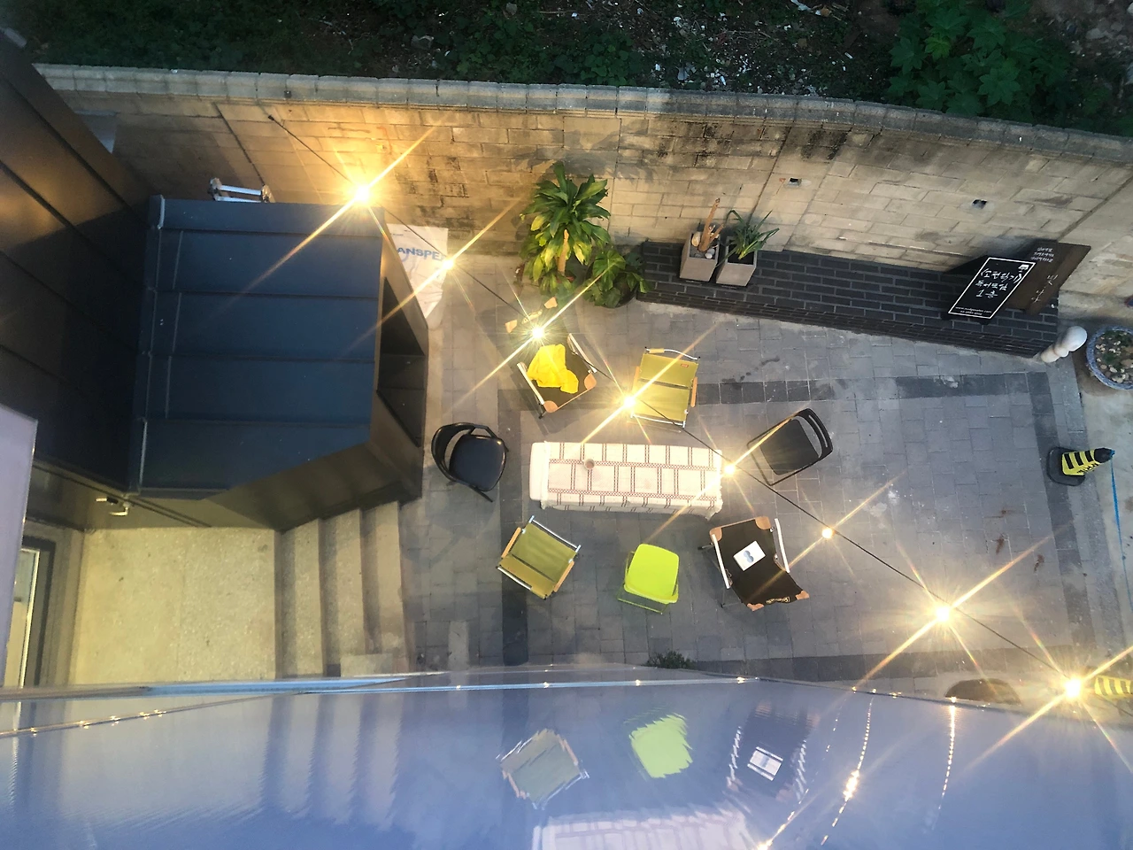 후다닥 옥탑방에 올라가 몇 개의 박스를 뒤져 오징어 전구를 찾아냈다. H 씨와 2층 현관 난간과 옥상 계단을 연결했다. 그저 고정할만한 장소를 찾아 양끝을 고정하면 되는 단순한 일이라고 생각했으나 다닥다닥 붙은 전구끼리 부딪혀 전구가 깨질뻔한 고비도 있었고, 생각보다 줄이 너무 무거워 전선을 놓칠뻔한 고비도 있었지만 무사히 연결했다.