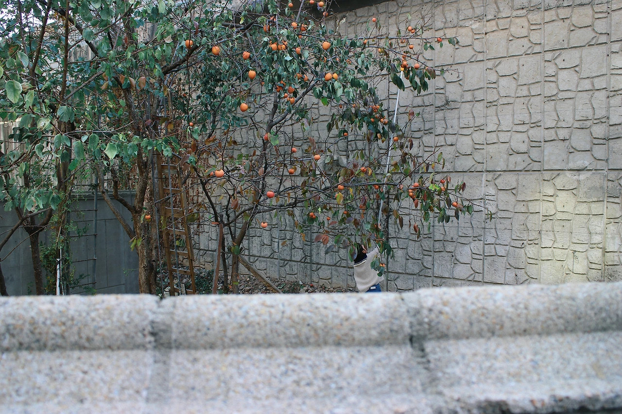 문제는 담이었다. (용감한) 동생은 높은 사다리를 성큼성큼 올라가 담 너머로 빠르게 안착했지만, (세상 제일 쫄보인) 나는 사다리를 몇 계단 올라보지도 못한 채 다리를 부들거리며 포기했다. 높은 사다리에 오르는 것은 생각보다 무서웠다. 그렇게 1차 시기는 담 너머 동생이 감 따는 모습을 촬영하며 종료.