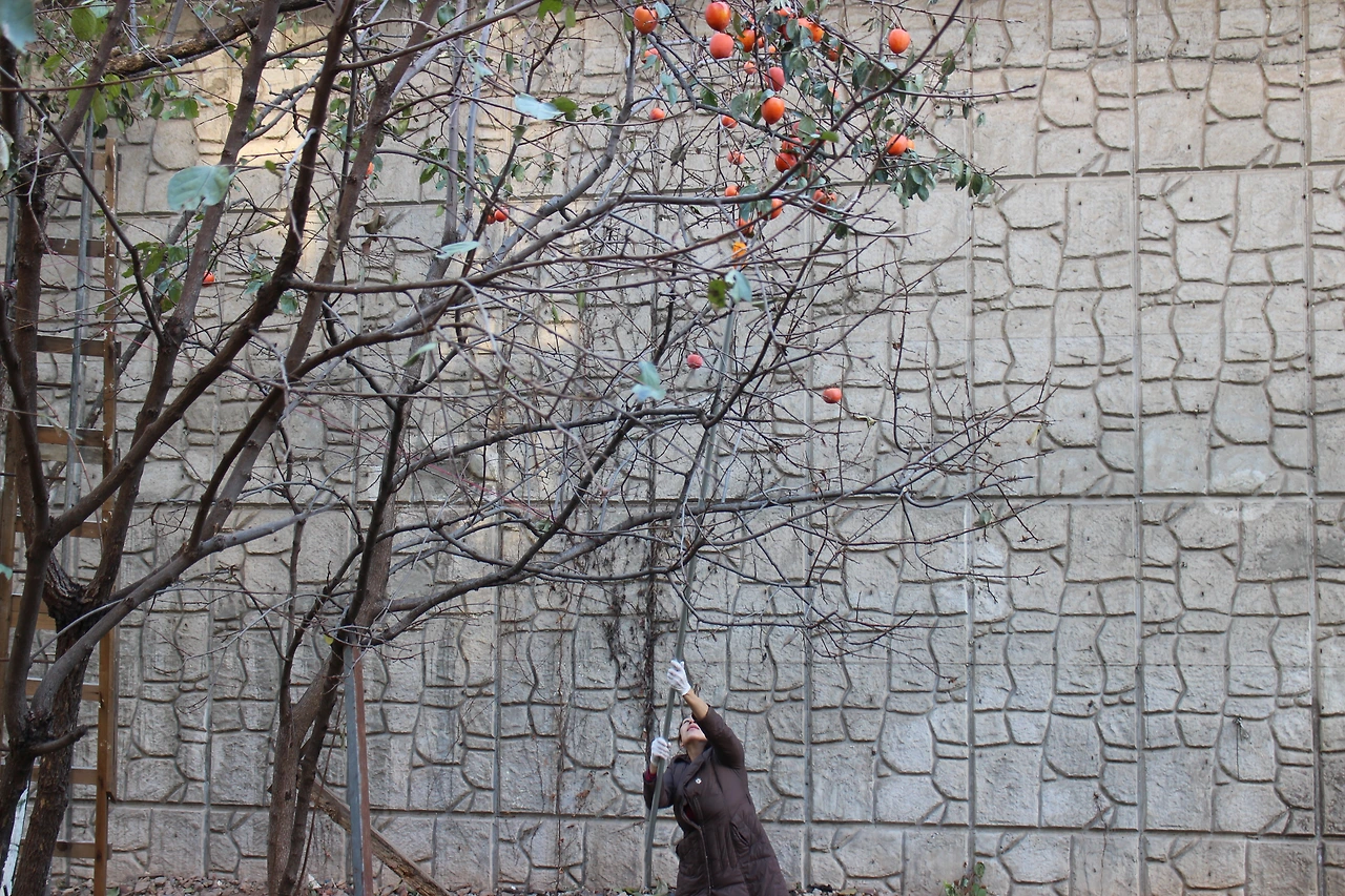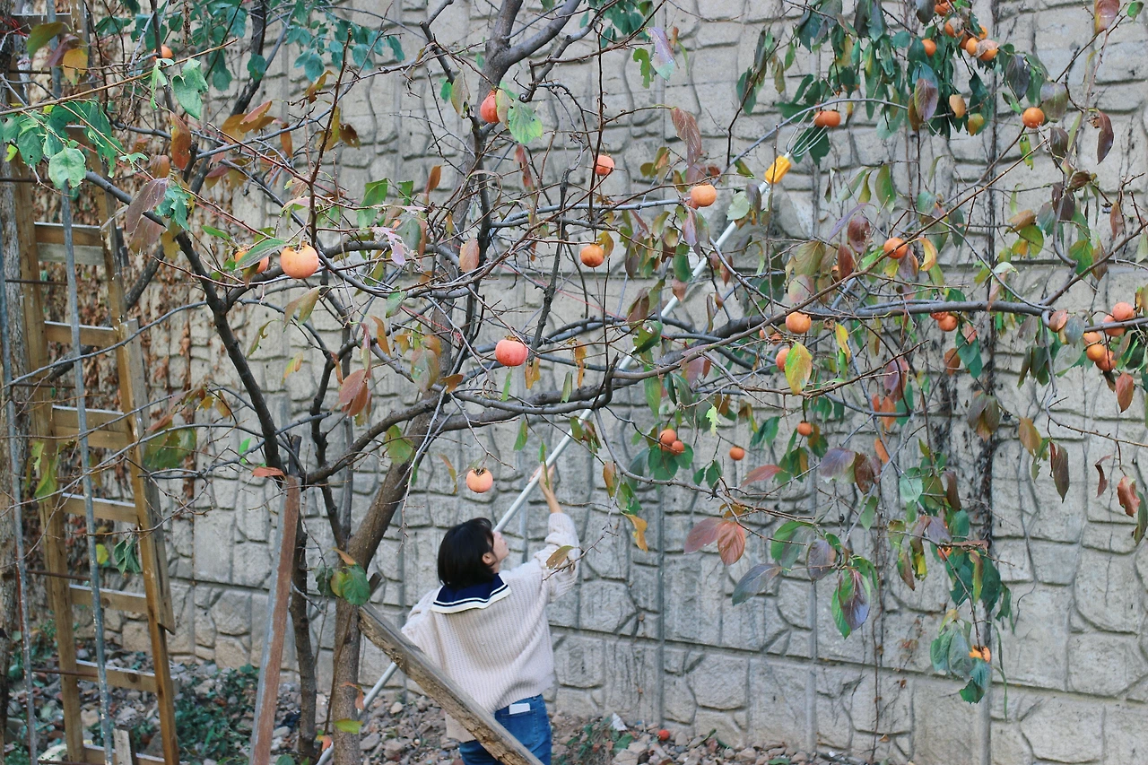 바로 감을 딸 줄 알았지만 역시나 우리의 게으름 때문에 한 달이 훌쩍 지나갔다. 잎들은 눈에 띄게 쪼그라들고 꽤 많은 감들이 홍시로 변하고 있었다. 더 지체하다가 홍시가 되면 장대로 딸 수 없겠다는 판단에 즉흥적으로 2차 감 따기가 진행되었다. 나는 이번에도 담 넘기에 실패했다.