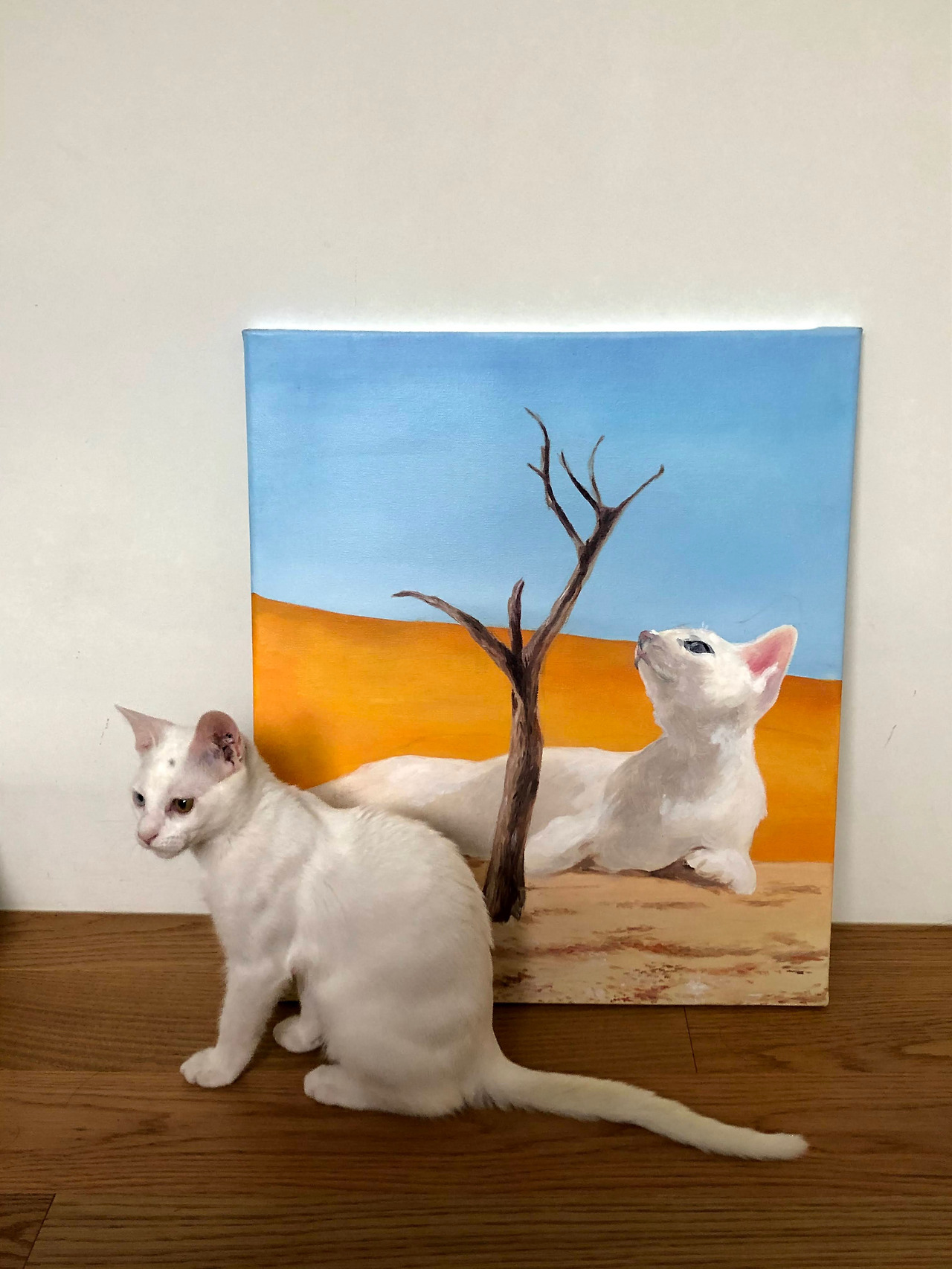 내가 정한 첫 번째 그림 주제는 고양이 '라이'였다. 폭우로 죽을뻔한 라이가 남은 냥생은 뽀송뽀송하게 살라는 기원의 의미를 담아 사막에 있는 라이를 그렸다. 이 그림은 지금 부적처럼 2층에 놓아두었다.