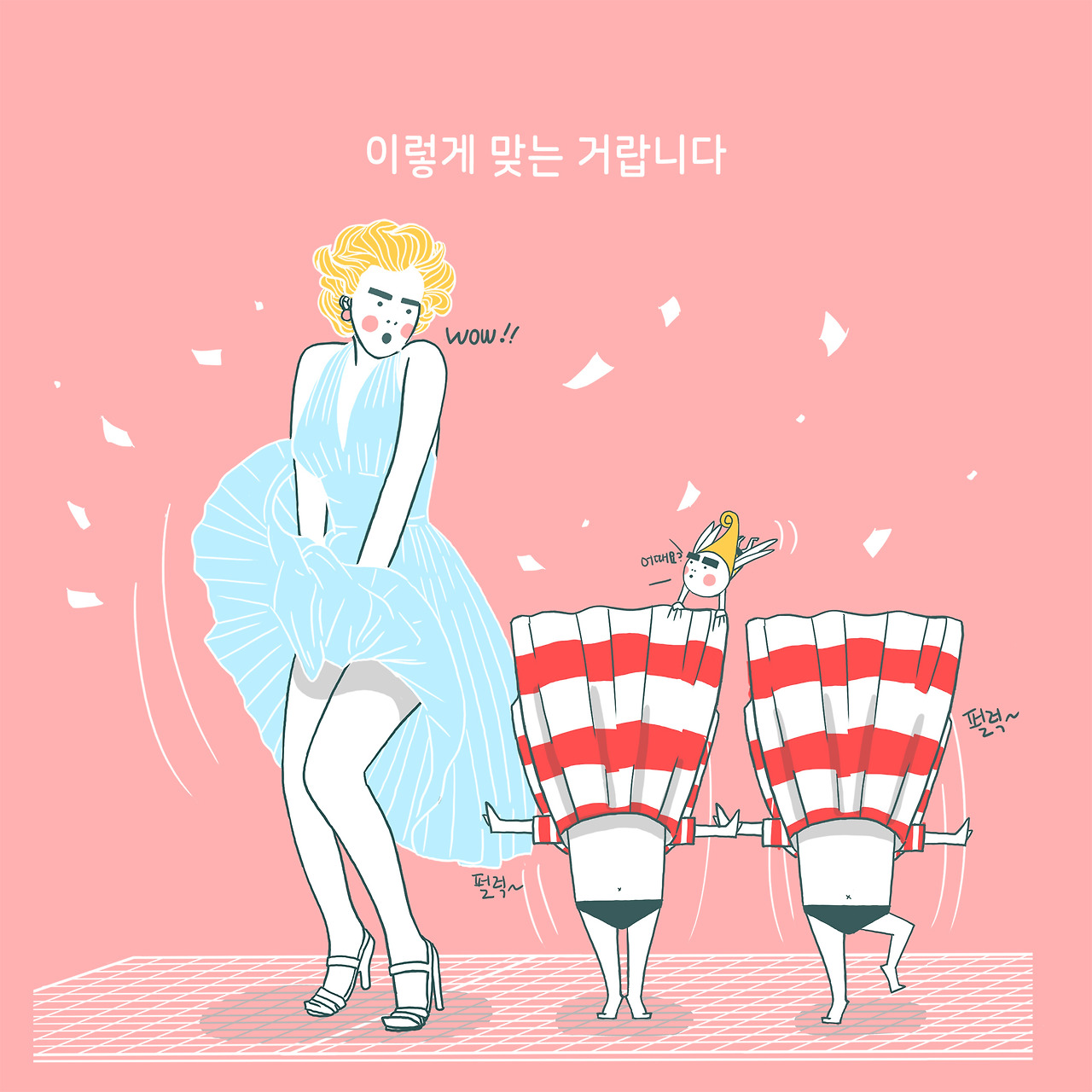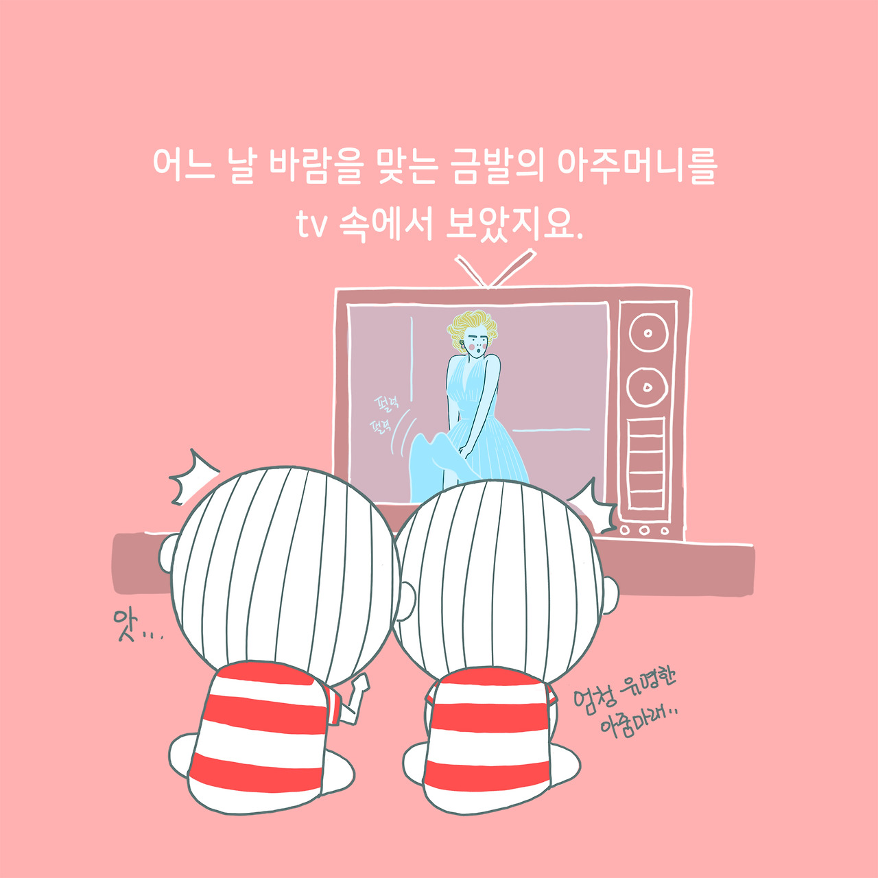 어느 날 바람을 맞는 금발의 아주머니가 나오는 모습을 tv속에서 보았어요. 환풍기에서 바람을 맞으며 치마를 펄럭이는 모습이었고 주위에 사람들은 그런 모습을 보며 환호하고 있었습니다. 오레오오가 처음 보는 광경이었죠. 엄마는 이 아주머니는 정말 유명한 아주머니라고 말씀해주었답니다.