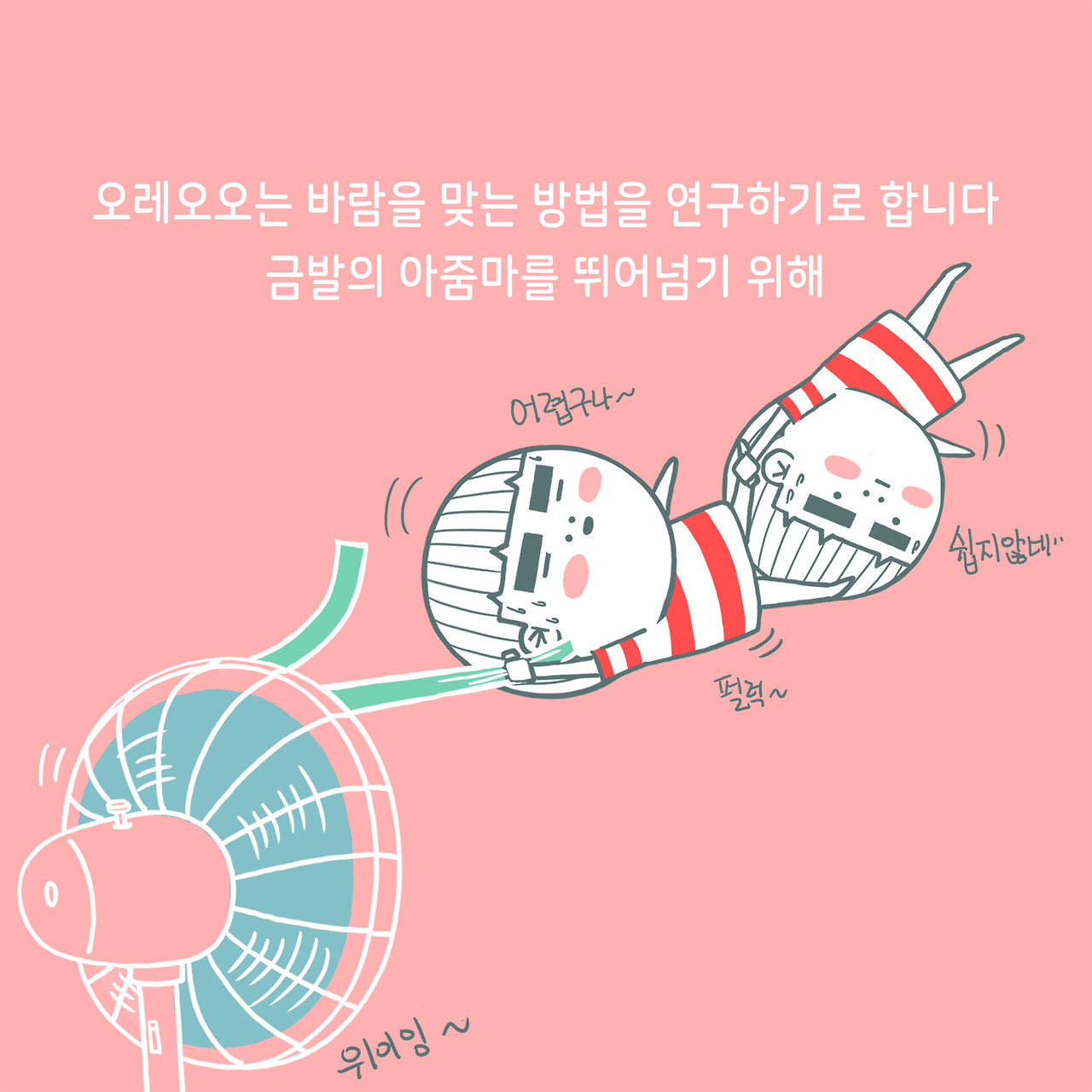 오레오오는 바람을 맞는 모습을 사람들에게 보여주기로 결심하였고 열심히 연습하고 있답니다. 쌍둥이라는 부분을 부정하고 안보이기 위해서 가리는 시간보단 멋진 바람맞는 모습에 더 집중하기로 한 거죠.