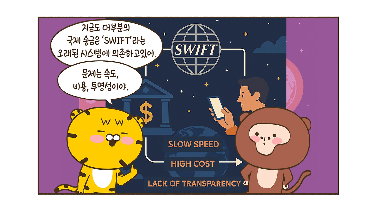 “지금도 대부분의 국제 송금은 ‘SWIFT’라는 오래된 시스템에 의존하고 있어.”