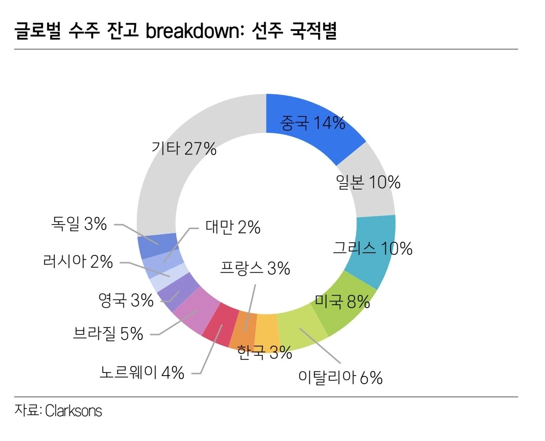 6. 삼성증권은 미국 무역대표부(이하 USTR)가 중국 해운사와 중국산 선박에 대한 입항 수수료 부과를 결정했지만, 미중 무역 협상에 따라 유동적이며 최종안은 5월 19일에 도출될 예정이라고 코멘트합니다. 이번 발표에서 주목할 만한 부분은 자동차 운반선과 LNG선, 자동차 운반선은 미국외 지역에서 건조된 ‘모든’ 선박을 대상으로 수수료를 부과하는 내용입니다. LNG선은 2028년부터 전체 수출량의1%를 미국산 선박으로 운송하고, 2047년까지 해당 비중을 15%로 늘린다는 계획입니다. 장기적으로 한국 조선업에 악재입니다.