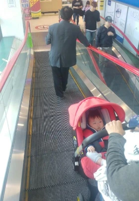 나중에 알고 보니 일반 카트는 홈이 있어 미끄러지지 않는데, 유모차는 홈이 없어 행여 미끄러지면 자기가 몸으로 막겠다고 서계신다는 거였다.