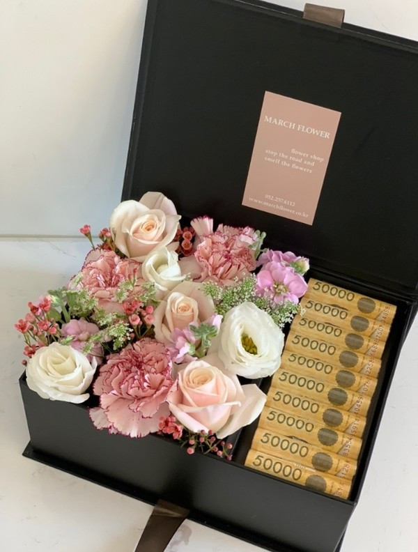 누군가 말했다. 머니머니 해도 현금이 최고라고. 언제부터인가 꽃바구니에 용돈을 넣어드리는 ‘용돈 플라워박스’가 유행하기 시작했다. 과거 현금 봉투 하나로 심플한 효도가 가능했다면, 꽃을 더해 ‘센스’라는 옵션을 추가할 수 있다. 요즘 유행한다던 머니건으로 영화 <웰컴 투 동막골>에서 팝콘이 눈처럼 내리는 장면처럼 현금을 사방에 쏴 드리고 싶었지만, 올해는 셀프 플라워 박스 만들기로 우아한 효녀가 되기로 했다. 아, 물론 현찰은 기본 옵션이다. 원데이 클래스를 가볼까 싶기도 했지만 시간이 촉박했다. 한편으론 꽃 구매부터 제작까지 셀프로 해보고 싶은 열정이 생겼다. 열정은 때론 화를 부른다.