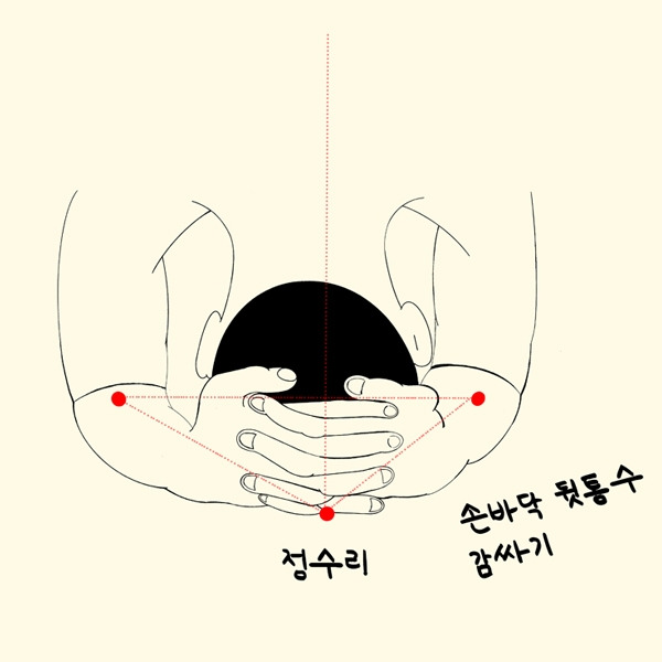 • 손가락은 단단히 깍지 껴서 컵 모양(뒤통수 감싸듯).