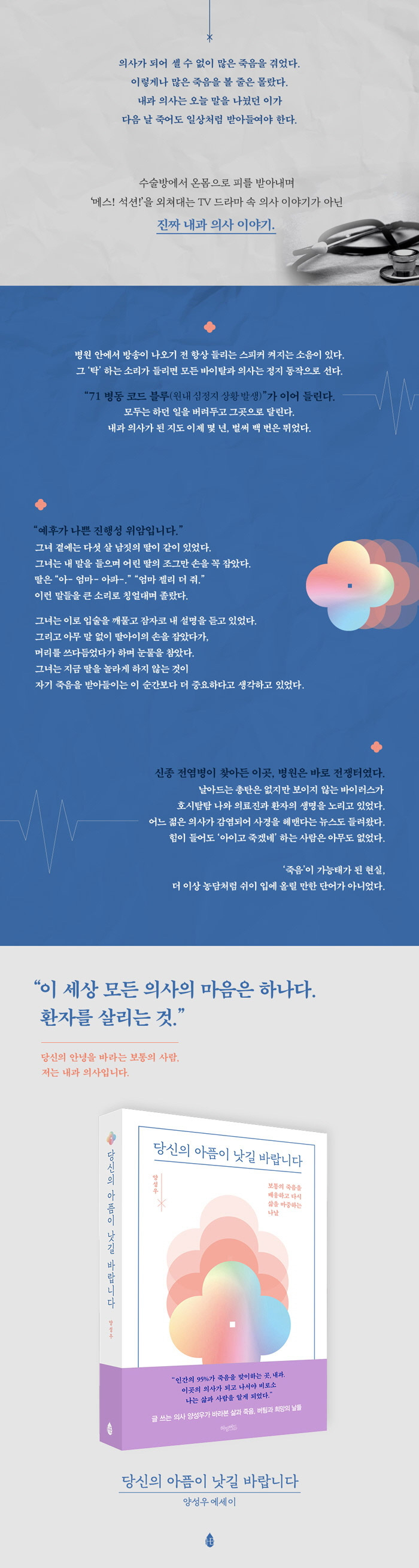 출간이 되게 되었으니 썼던 글들을 검토하는데, 고통스럽기도 했습니다. 에피소드 하나하나가 기억에 남는 환자였기에 다시 떠올리기가 쉽지 않았던 것이었지요. 그 분들에게 배웠던 삶의 의미, 이제는 진짜로 가슴 깊이 새기고 갈 때가 된 것 같습니다.